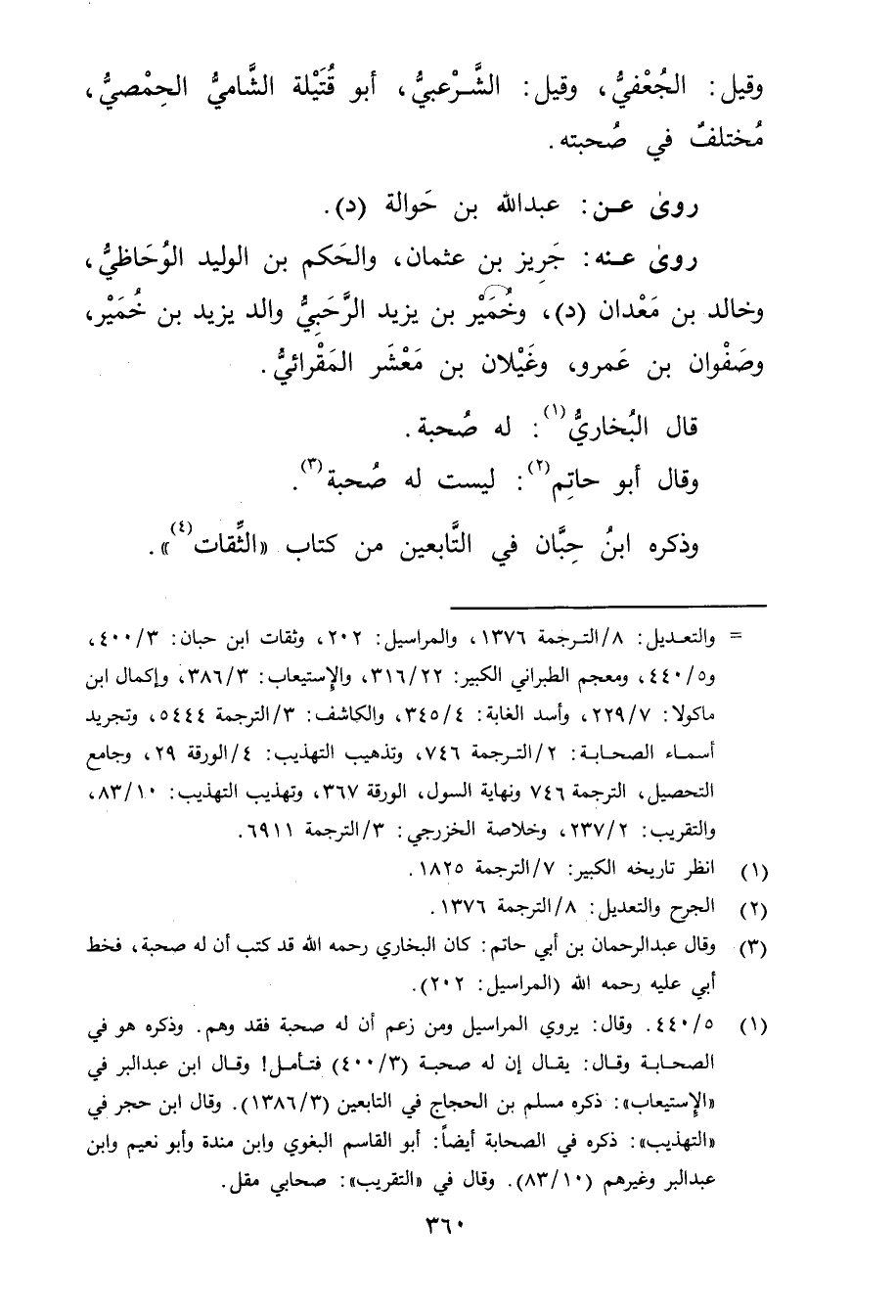 (3) وَقَال عبد الرحمن بن أَبي حاتم: كان البخاري رحمه الله قد كتب أن لهُ صُحبَةٌ، فخط أبي عليه رحمه الله (المراسيل: 202) .