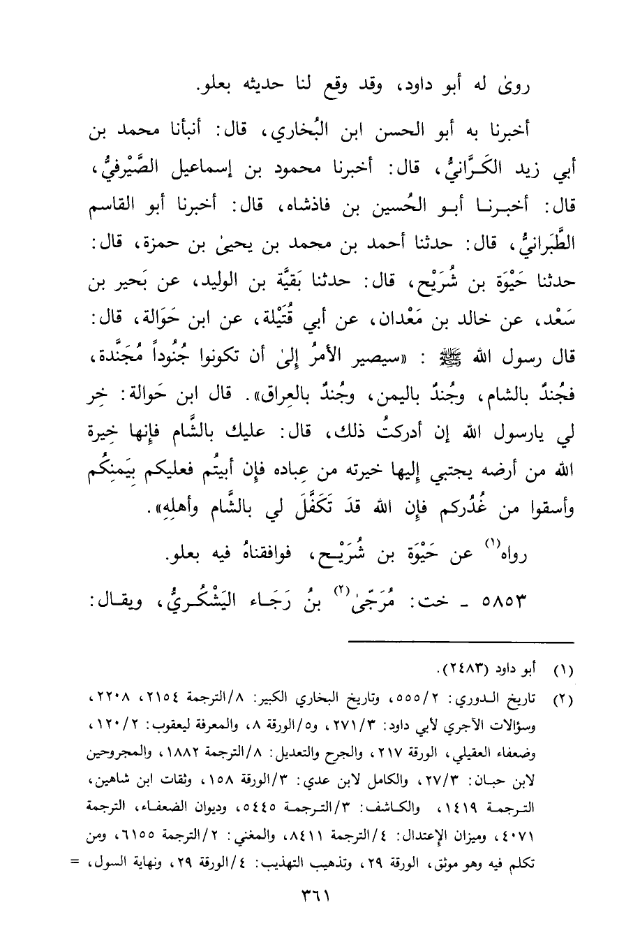 أخبرنا بِهِ أَبُو الْحَسَنِ بْنُ الْبُخَارِيِّ، قال: أَنْبَأَنَا مُحَمَّدُ بْنُ أَبي زَيْدٍ الْكَرَّانِيُّ، قال: أَخْبَرَنَا مَحْمُودُ بن إسماعيل الصيرفي، قافل: أَخْبَرَنَا أَبُو الْحُسَيْنِ بْنُ فَاذْشَاهِ، قال: أخبرنا أَبُو الْقَاسِمِ الطَّبَرَانِيُّ، قال: حَدَّثَنَا أَحْمَد بْن مُحَمَّد بْنِ يَحْيَى بْنِ حَمْزَةَ، قال: حَدَّثَنَا حَيْوَةُ بْنُ شُرَيْحٍ، قال: حَدَّثَنَا بَقِيَّةُ بْنُ الْوَلِيدِ، عَنْ بحير بْن سعد، عَنْ خالد بْنِ مَعْدَانِ، عَن أَبِي قُتَيْلَةَ، عَنِ ابْنِ حَوَالَةَ، قال: قال رَسُول اللَّهِ صلى الله عليه وسَلَّمَ: "سَيَصِيرُ الأَمْرُ إِلَى أَنْ تَكُونُوا جُنُودًا مُجَنَّدَةً، فَجُنْدٌ بِالشَّامِ، وجُنْدٌ بِالْيَمَنِ، وجُنْدٌ بِالْعِرَاقِ ". قال ابْنُ حَوَالَةَ: خِرْ لِي يَا رَسُولَ اللَّهِ إِنْ أَدْرَكْتُ ذَلِكَ، قال: عليك بالشام فَإِنَّهَا خِيْرَةُ اللَّهِ مِنْ أَرْضِهِ يَجْتَبِي إِلَيْهَا خِيْرَتَهُ مِنْ عِبَادِهِ فَإِنْ أَبَيْتُمْ فَعَلَيْكُمْ بِيَمِنِكُمْ وأَسْقُوا مِنْ غُدُرِكُمْ فَإِنَّ اللَّهَ قَدْ تَكَفَّلَ لِي بِالشَّامِ وأَهْلِهِ.