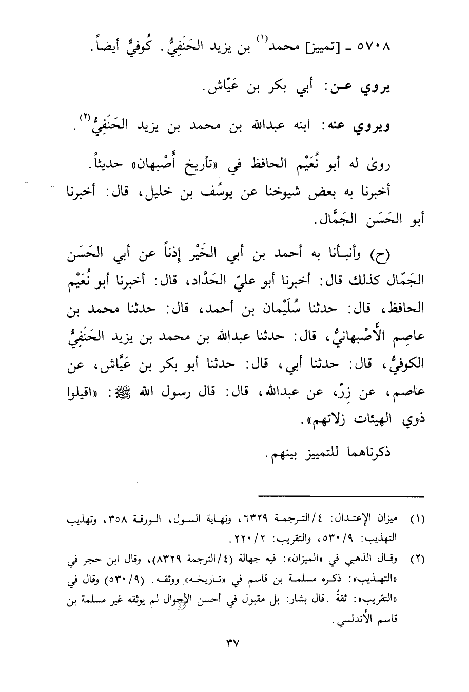 (ح) وأَنْبَأَنَا بِهِ أَحْمَدُ بْنُ أَبي الْخَيْرِ إِذْنًا عَن أَبِي الْحَسَنِ الْجَمَّالِ كَذَلِكَ قال: أَخْبَرَنَا أَبُو عَلِيّ الحداد، قال: أَخْبَرَنَا أَبُو نعيم الحافظ، قال: حَدَّثَنَا سُلَيْمان بْنُ أَحْمَدَ، قال: حَدَّثَنَا مُحَمَّدُ بْنُ عَاصِمٍ الأَصْبَهَانِيُّ، قال: حَدَّثَنَا عَبد اللَّهِ بْن مُحَمَّد بْنِ يَزِيدَ الْحَنَفِيُّ الْكُوفِيُّ، قال: حَدَّثَنَا أبي، قال: حَدَّثَنَا أَبُو بَكْرِ بْن عياش، عَنْ عاصم، عن زر، عن عَبد اللَّه، قال: قال رَسُولُ اللَّهِ صلى الله عليه وسلم: "أَقِيلُوا ذَوِي الْهَيْئَاتِ زَلاتِهِمْ.