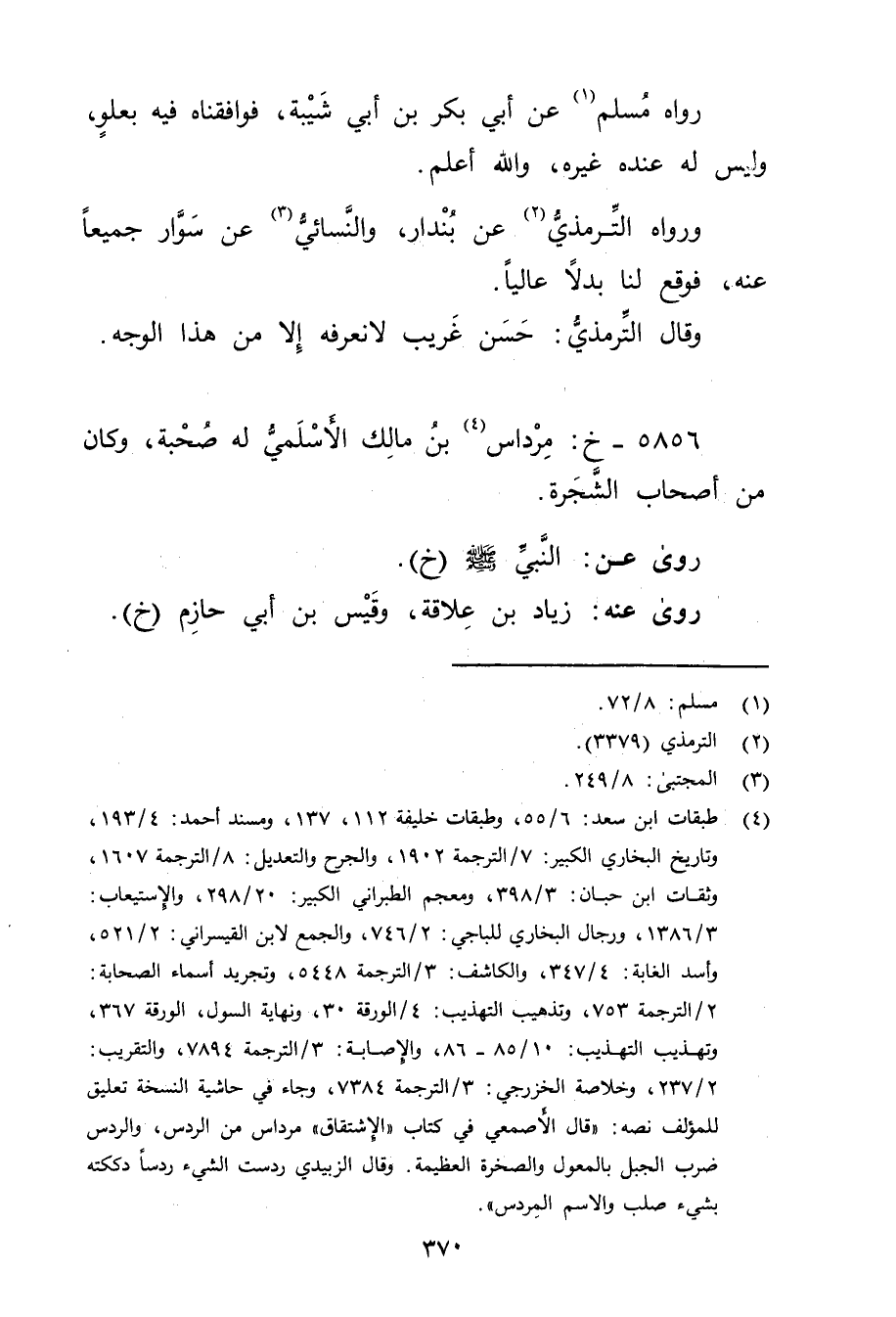 (4) طبقات ابن سعد: 6 / 55، وطبقات خليفة 112، 137، ومسند أحمد: 4 / 193، وتاريخ البخاري الكبير: 7 / الترجمة 1902، والجرح والتعديل: 8 / الترجمة 1607، وثقات ابن حبان: 3 / 398، ومعجم الطبراني الكبير: 20 / 298، والاستيعاب: 3 / 1386، ورجال البخاري للباجي: 2 / 746، والجمع لابن القيسراني: 2 / 521، وأسد الغابة: 4 / 347، والكاشف: 3 / الترجمة 5448، وتجريد أسماء الصحابة: 2 / الترجمة 753، وتذهيب التهذيب: 4 / الورقة 30، ونهاية السول، الورقة 367، وتهذيب التهذيب: 10 / 85 - 86، والاصابة: 3 / الترجمة 7894، والتقريب: 2 / 237، وخلاصة الخزرجي: 3 / الترجمة 7384، وجاء في حاشية النسخة تعليق للمؤلف نصه: "قال الأَصْمَعِيّ في كتاب "الاشتقاق "مرداس من الردس، والردس ضرب الجبل بالمعول والصخرة العظيمة. وَقَال الزبيدي ردست الشئ ردسا دككته بشيءٍ صلب والاسم المردس ".