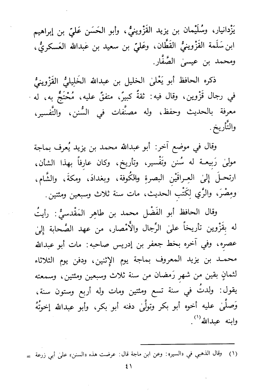 وَقَال فِي موضع آخر: أَبُو عَبْد اللَّهِ مُحَمَّد بْن يزيد يعرف بماجة مولي ربيعة له سنن وتفسير، وتأريخ، وكان عارفا بهذا الشأن، ارتحل إلي العراقين البصرة والكوفة، وبغداد، ومكة، والشام، ومصر، والري لكتب الحديث، مات سنة ثلاث وسبعين ومئتين.