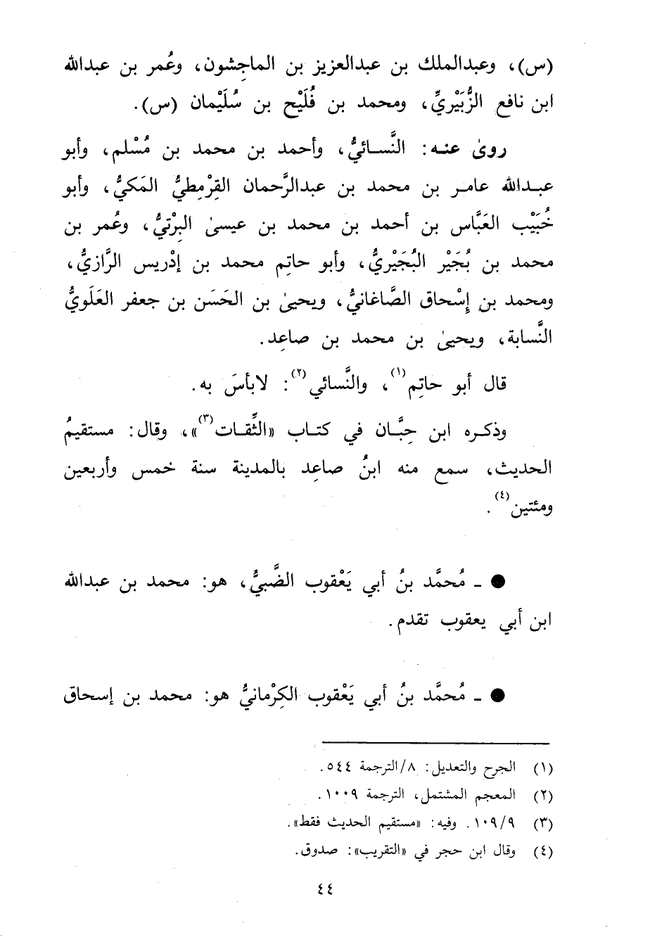 وذكره ابنُ حِبَّان في كتاب "الثقات (3) "، وَقَال: مستقيم الحديث، سمع منه ابن صاعد بالمدينة سنة خمس وأربعين ومئتين (4) .