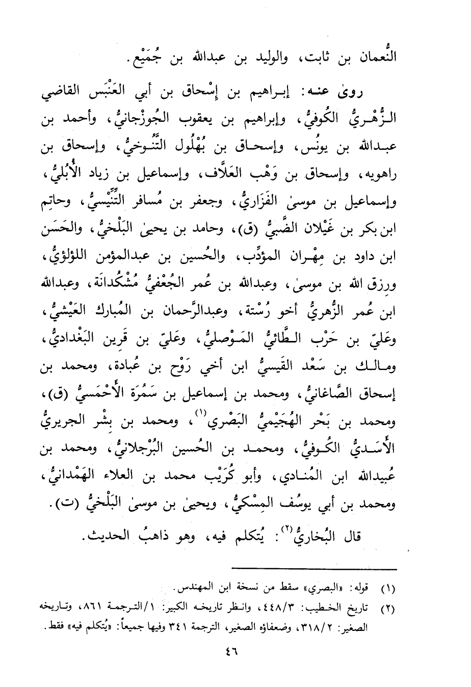 (2) تاريخ الخطيب: 3 / 448، وانظر تاريخه الكبير: 1 / الترجمة 861، وتاريخه الصغير: 2 / 318، وضعفاؤه الصغير، الترجمة 341 وفيها جميعا: "يتكلم فيه "فقط ".