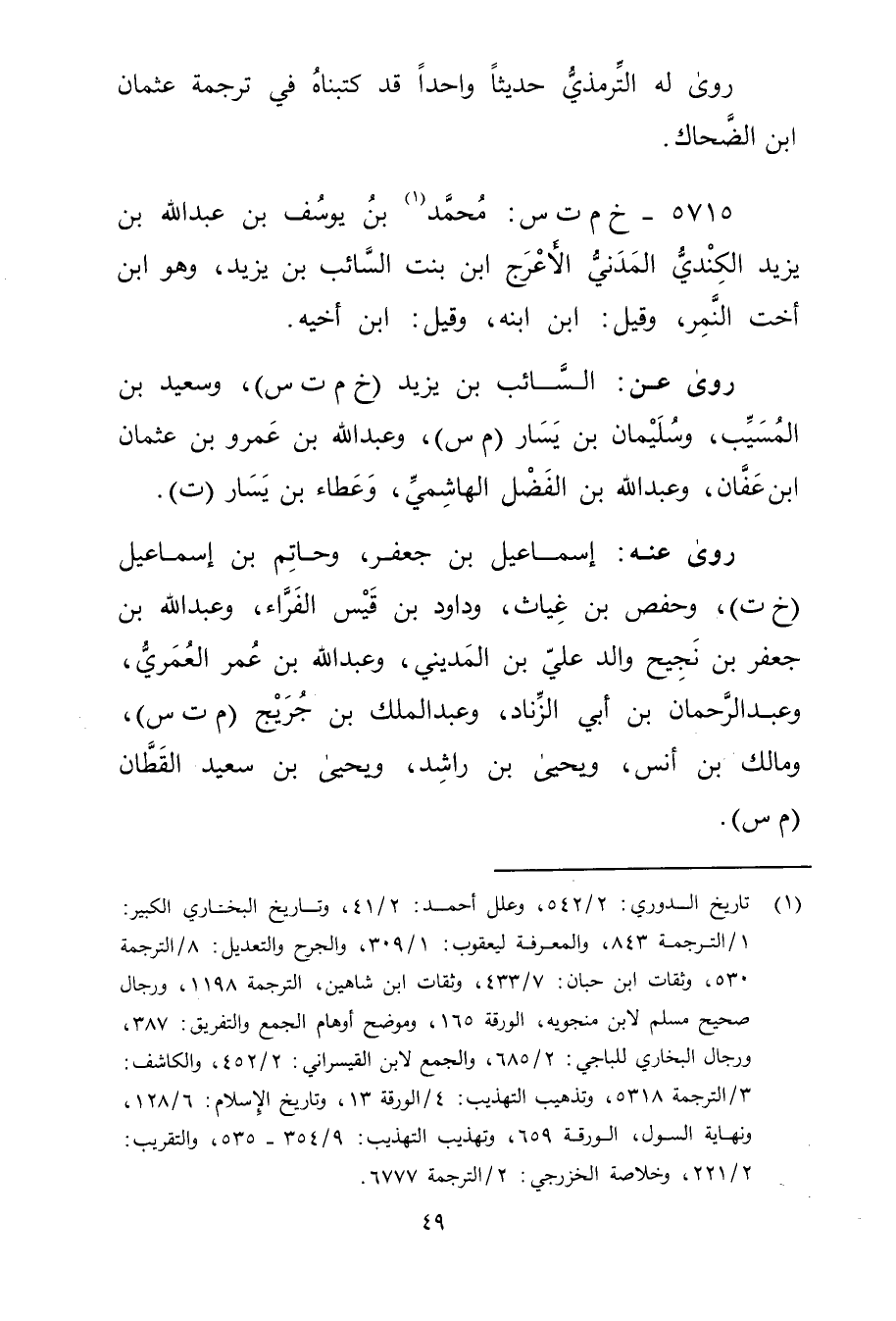 5715 - خ م ت س: مُحَمَّد بن يوسف بن عَبد الله بن يزيد الكندي المدني الأعرج ابْن بنت السائب بْن يزيد (1) ، وهو ابن أخت النمر، وقيل: ابن ابنه، وقيل: ابن أخيه.