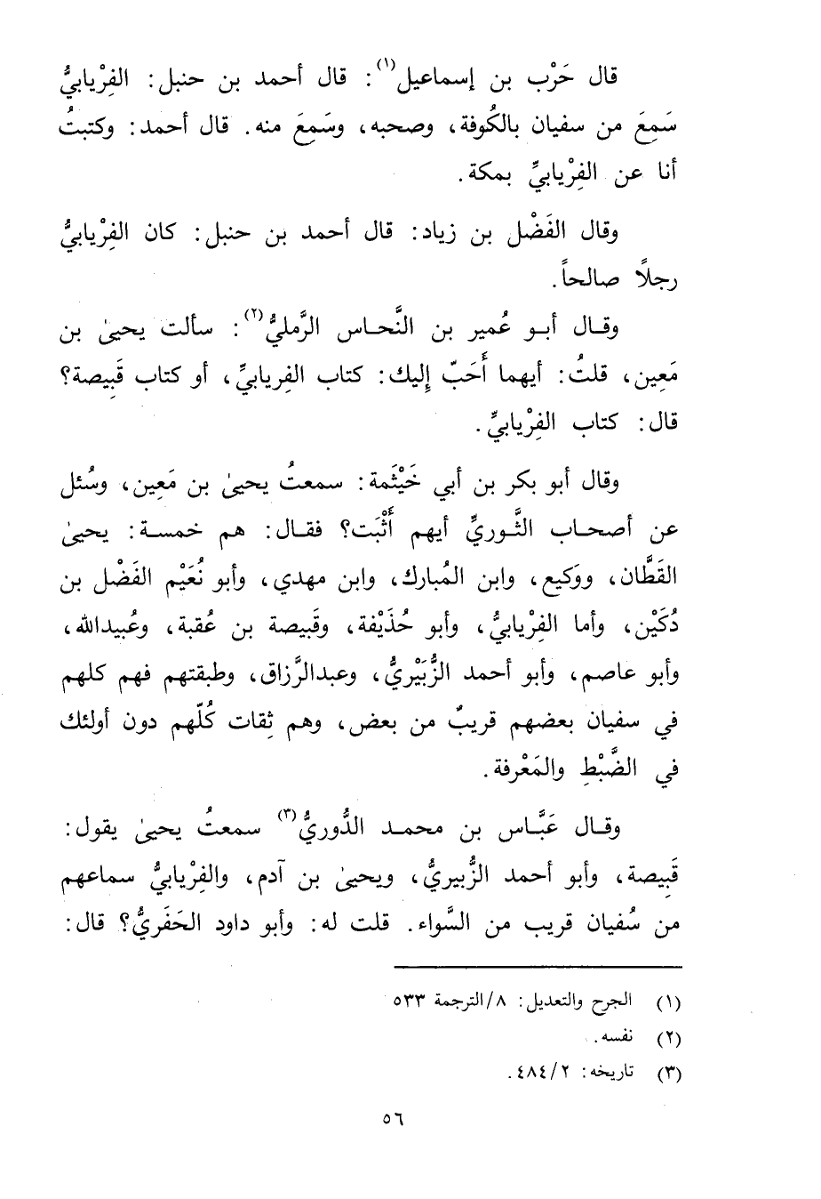 وَقَال عباس بْن مُحَمَّد الدوري (3) سمعت يحيى يقول: قبيصة، وأبو أحمد الزبيري، ويحيى بْن آدم، والفريابي سماعهم من سفيان قريب من السواء. قلت له: وأبو داود الحفري؟ قال: