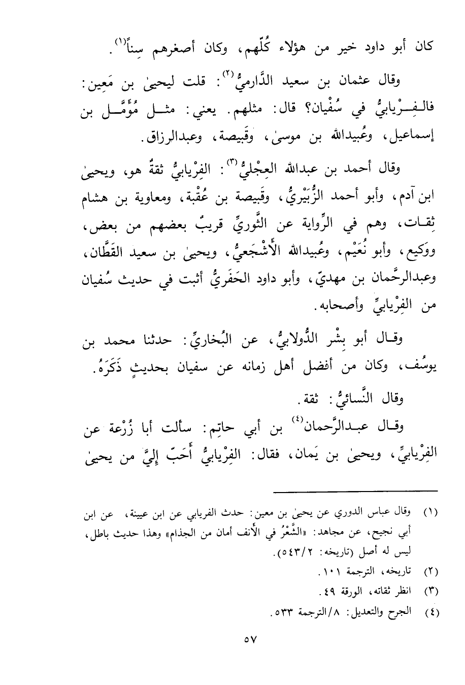 وَقَال عثمان بْن سَعِيد الدارمي (2) : قلت ليحيى بْن مَعِين: فالفريابي في سفيان؟ قال: مثلهم. يعَنْي: مثل مؤمل بْن إسماعيل، وعُبَيد الله بن مُوسَى، وقبيصة، وعبد الرزاق.