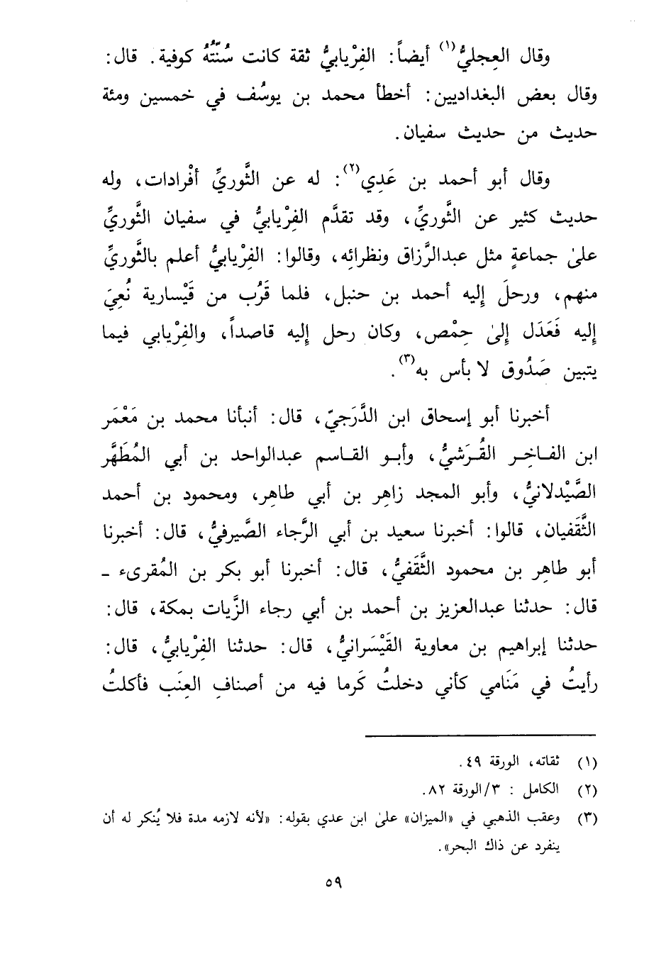 وَقَال العجلي (1) أيضا: الفريابي ثقة كانت سنته كوفية. قال: وَقَال بعض البغداديين: أخطأ مُحَمَّد بْن يوسف في خمسين ومئة حديث من حديث سفيان.