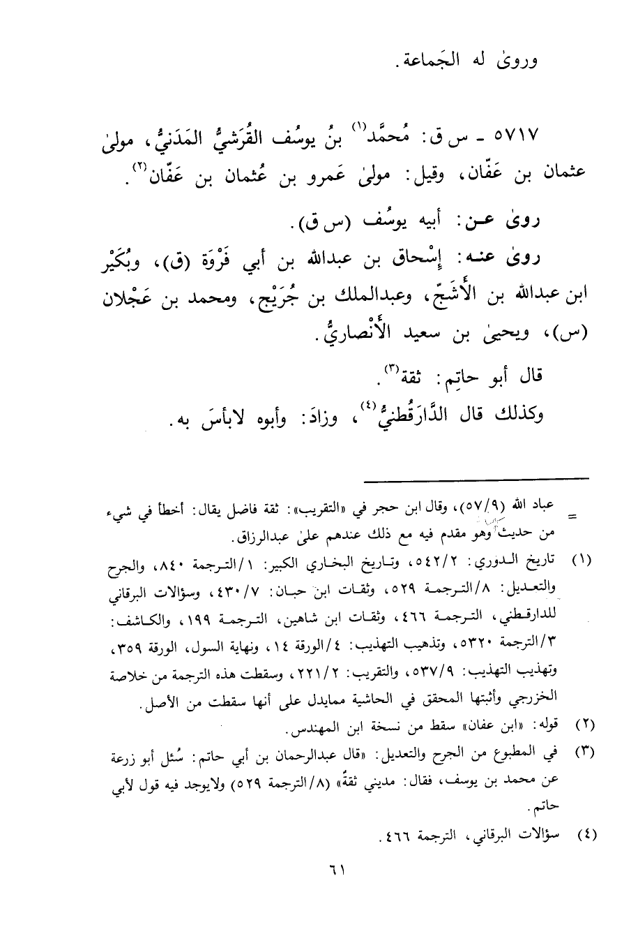 5717 - س ق: مُحَمَّد بن يوسف القرشي المدني (1) ، مولى عثمان بْن عفان، وقيل: مولى عَمْرو بْن عثمان بْن عفان (2) .