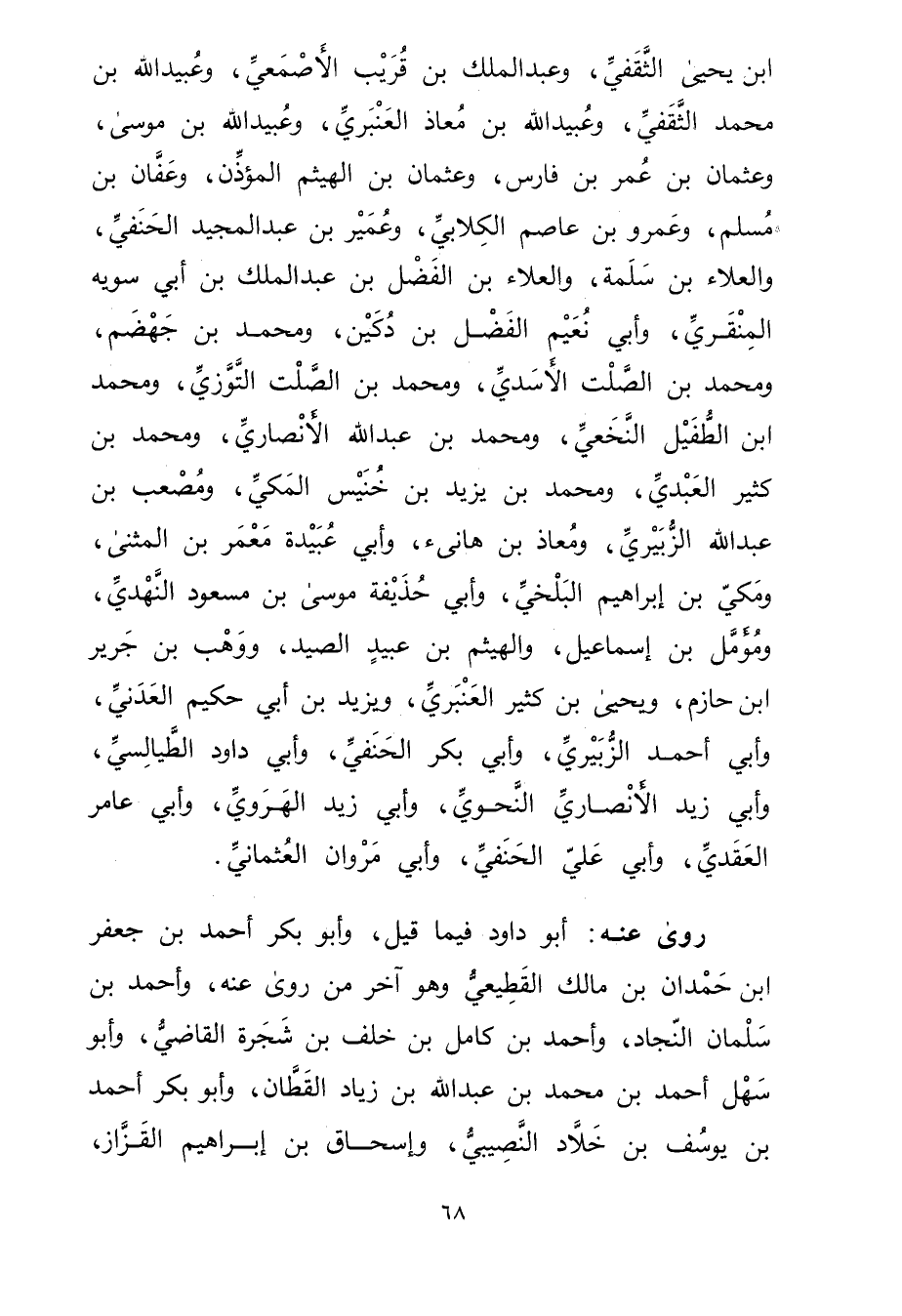 ابن يحيى الثقفي، وعبد الملك بْن قريب الأَصْمَعِيّ، وعُبَيد الله بْن مُحَمَّد الثقفي، وعُبَيد الله بْن معاذ العَنْبري، وعُبَيد الله بْن مُوسَى، وعُثْمَان بْن عُمَر بْن فارس، وعثمان بن الهيثم المؤذن، وعفان بْن مسلم، وعَمْرو بْن عاصم الكِلابي، وعمير بْن عَبد المجيد الحنفي، والعلاء بْن سلمة، والعلاء بْن الفضل بْن عَبد المَلِك بْن أَبي سوية المنقري، وأبي نعيم الفضل بْن دكين، ومحمد بْن جهضم، ومحمد بْن الصلت الأسدي، ومحمد بْن الصلت التوزي، ومحمد ابن الطفيل النخعي، ومحمد بْن عَبد الله الأَنْصارِيّ، ومحمد بْن كثير العبدي، ومحمد بْن يزيد بْن خنيس المكي، ومصعب بْن عَبد الله الزبيري، ومعاذ بْن هانئ، وأَبِي عُبَيدة معمر بْن المثنى، ومكي بْن إِبْرَاهِيم البلخي، وأبي حذيفة مُوسَى بْن مسعود النهدي، ومؤمل بْن إِسْمَاعِيل، والهيثم بْن عُبَيد الصيد، ووهب بْن جرير ابن حازم، ويحيى بْن كثير العَنْبري، ويزيد بْن أَبي حكيم العدني، وأبي أحمد الزبيري، وأبي بكر الحنفي، وأبي داود الطيالسي، وأبي زيد الأَنْصارِيّ النحوي، وأبي زيد الهروي، وأبي عامر العقدي، وأبي عَلِيّ الحنفي، وأبي مروان العثماني.