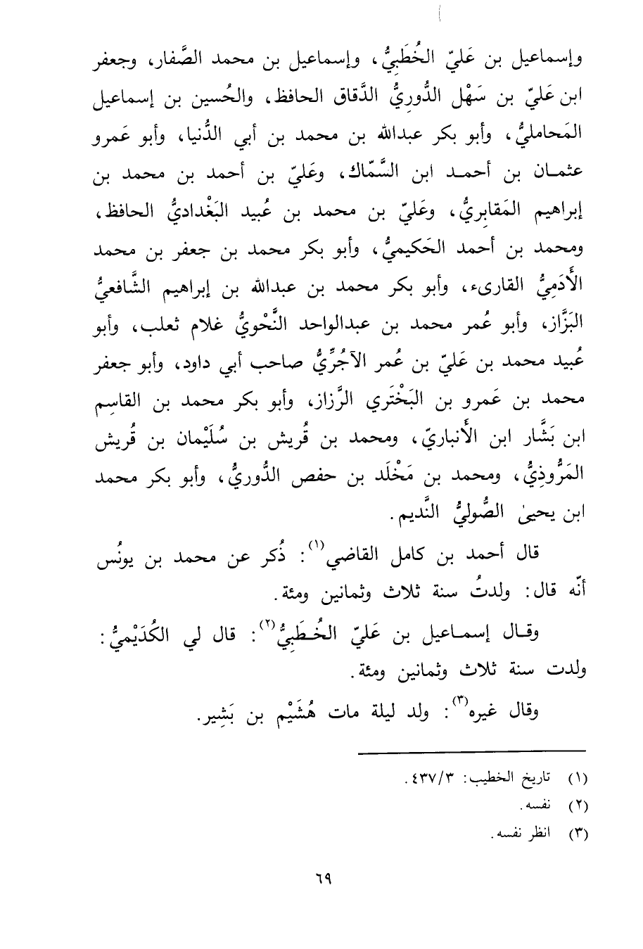 وَقَال إِسْمَاعِيل بْن علي الخطبي (2) : قال لي الكديمي: ولدت سنة ثلاث وثمانين ومئة.