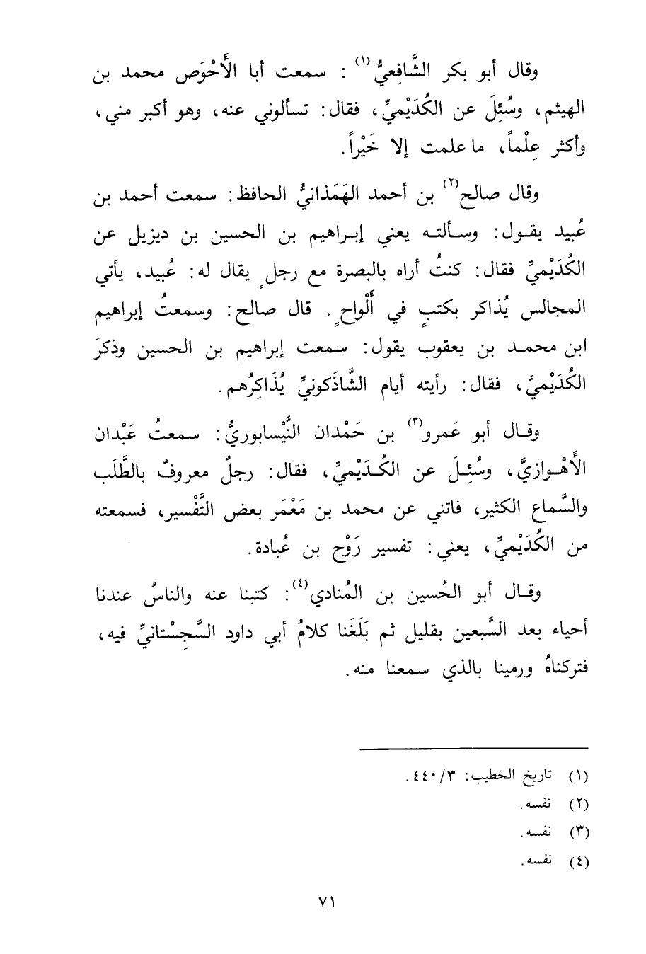 وَقَال صالح (2) بْن أحمد الهمذاني الحافظ: سمعت أحمد بْن عُبَيد يقول: وسألته يعَنْي إبراهيم بْن الحسين بْن ديزيل عَنِ الكديمي فقال: كنت أراه بالبصرة مع رجل يقال له: عُبَيد، يأتي المجالس يذاكر بكتب في ألواح. قال صالح: وسمعت إبراهيم ابن مُحَمَّد بْن يعقوب يقول: سمعت إبراهيم بْن الحسين وذكر الكديمي، فقال: رأيته أيام الشاذكوني يذاكرهم.