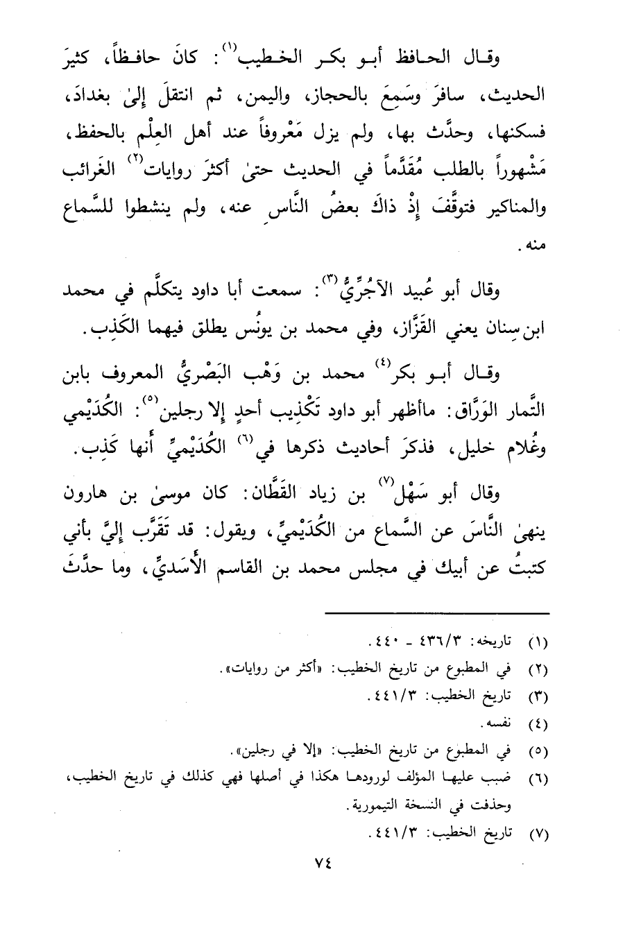 (6) ضبب عليها المؤلف لورودها هكذا في أصلها فهي كذلك في تاريخ الخطيب، وحذفت في النسخة التيمورية.