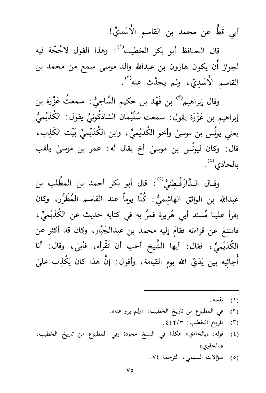 قال الحافظ أَبُو بكر الخطيب (1) : وهذا القول لاحجة فيه لجواز أن يكون هارون بْن عَبد الله والد موسى سمع من مُحَمَّد بْن الْقَاسِم الأسدي، ولم يحدث عَنْه (2) .