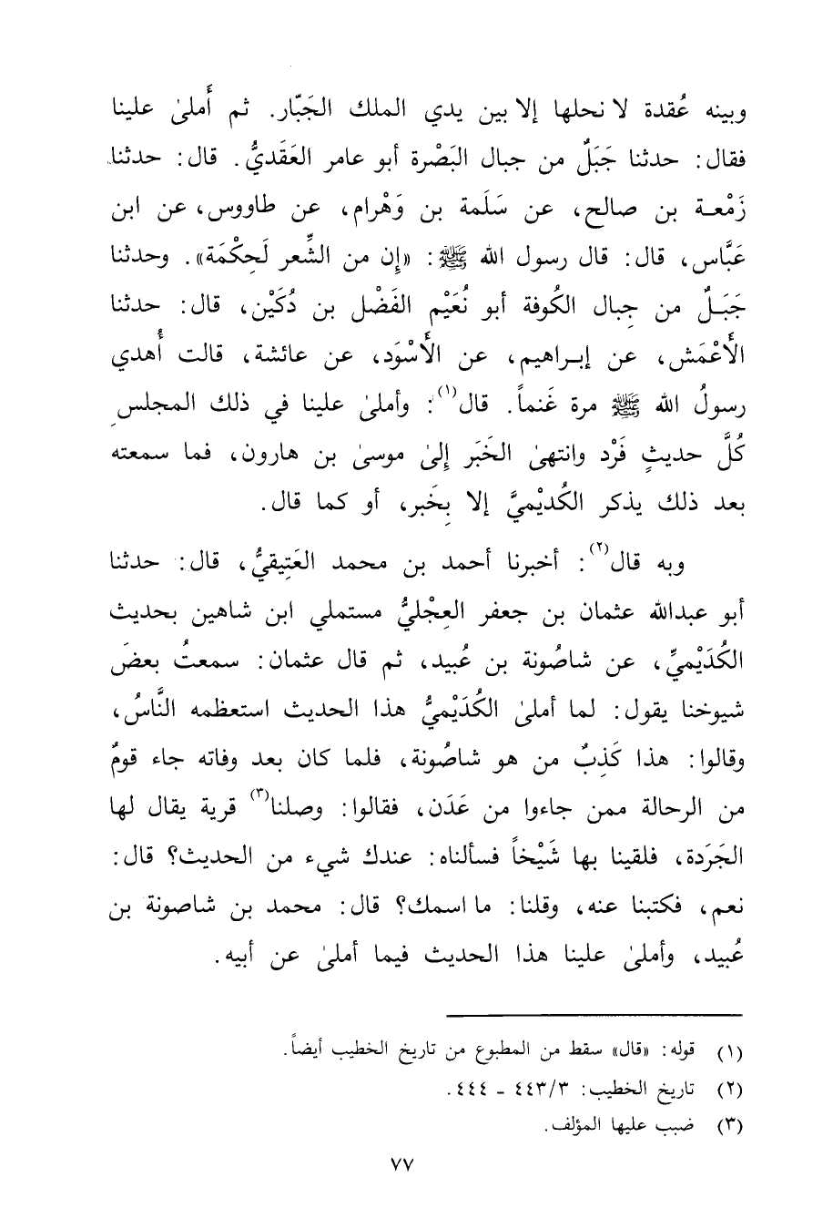 وبه قال (2) : أَخْبَرَنَا أحمد بْن مُحَمَّد العتيقي، قال: حَدَّثَنَا أبو عَبْد الله عثمان بْن جَعْفَر العجلي مستملي ابن شاهين بحديث الكديمي، عن شاصونة بْن عُبَيد، ثم قال عثمان: سمعت بعض شيوخنا يقول: لما أملى الكديمي هذا الحديث استعظمه الناس، وَقَالوا: هذا كذب من هو شاصونة، فلما كان بعد وفاته جاء قوم من الرحالة ممن جاءوا من عدن، فقالوا: وصلنا (3) قرية يقال لها الجردة، فلقينا بها شيخا فسألناه: عَنْدك شيء من الحديث؟ قال: نعم، فكتبنا عَنْه، وقلنا: ما اسمك؟ قال: مُحَمَّد بن شاصونة بْن عُبَيد، وأملى علينا هذا الحديث فيما أملى عَن أبيه.