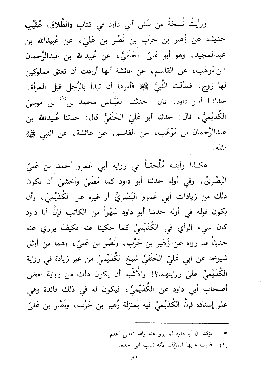 ورأيت نسخة من سنن أبي داود في كتاب "الطلاق "عقيب حديثه عَنْ زهير بْن حرب بْن نصر بْن علي، عَنْ عُبَيد اللَّهِ بْن عَبد المجيد، وهو أَبُو علي الحنفي، عَنْ عُبَيد اللَّه بْن عَبْد الرَّحْمَنِ ابن موهب، عَنِ الْقَاسِم، عَنْ عائشة أنها أرادت أن تعتق مملوكين لها زوج، فسألت النبي صَلَّى اللَّهُ عليه وسلم فأمرها أن تبدأ بالرجل قبل المرأة: حَدَّثَنَا أَبُو داود، قال: حَدَّثَنَا العباس محمد بن (1) بن موسى الكديمي، قال: حَدَّثَنَا أَبُو علي الحنفي قال: حَدَّثَنَا عُبَيد الله بْن عَبْد الرحمن بْن موهب، عَنِ الْقَاسِم، عَنْ عائشة، عَنِ النَّبِيِّ صلى الله عليه وسلم مثله.