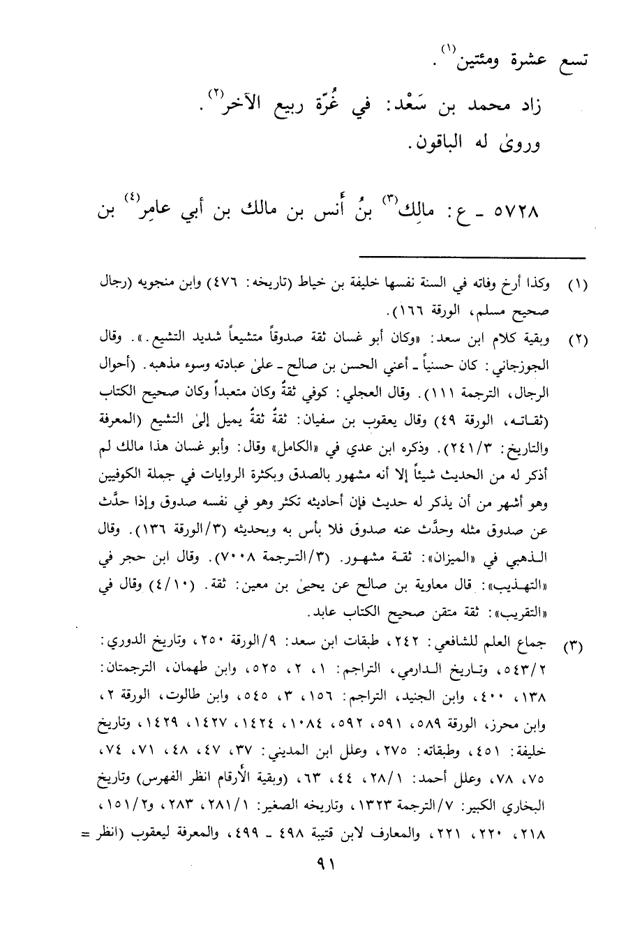 (3) جماع العلم للشافعي: 242، طبقات ابن سعد: 9 / الورقة 250، وتاريخ الدوري: 2 / 543، وتاريخ الدارمي، التراجم: 1، 2، 525، وابن طهمان، الترجمتان: 138، 400، وابن الجنيد، التراجم: 156، 3، 545، وابن طالوت، الورقة 2، وابن محرز، الورقة 589، 591، 592، 1084، 1424، 1427، 1429، وتاريخ خليفة: 451، وطبقاته: 275، وعلل ابن المديني: 37، 47، 48، 71، 74، 75، 78، وعلل أحمد: 1 / 28، 44، 63، (وبقية الارقام انظر الفهرس) وتاريخ البخاري الكبير: 7 / الترجمة 1323، وتاريخه الصغير: 1 / 281، 283، و2 / 151، 218، 220، 221، والمعارف لابن قتيبة 498 - 499، والمعرفة ليعقوب (انظر =
