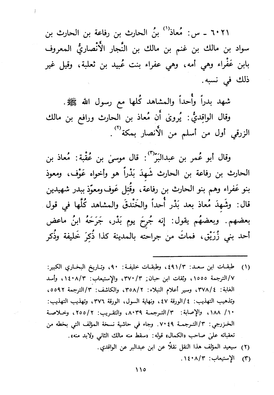 6021 - س: معاذ بن الحارث بن رفاعة بن الحارث بن سواد بن مالك (1) بن غنم بن مالك بن النجار الأَنْصارِيّ المعروف بابن عفراء وهي أمه، وهي عفراء بنت عُبَيد بْن ثعلبة، وقيل غير ذلك فِي نسبه.