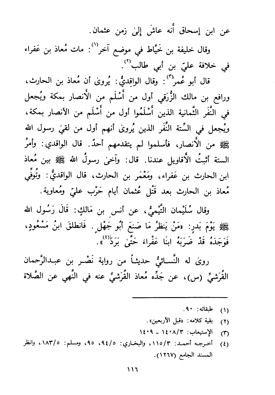 وَقَال خليفة بْن خياط فِي موضع آخر (1) : مات معاذ بن عفراء فِي خلافة علي بْن أَبي طالب (2) .