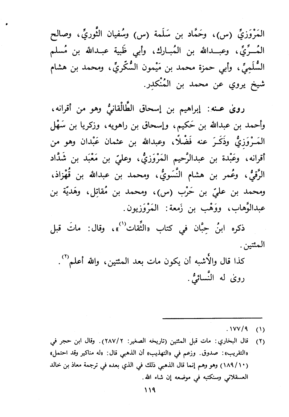 (2) قال البخاري: مات قبل المئتين (تاريخه الصغير: 2 / 287) وَقَال ابن حجر في "التقريب": صدوق. وزعم في "التهذيب "أن الذهبي قال: له مناكير وقد احتمل " (10 / 189) وهو وهم إنما قال الذهبي ذلك في الذي بعده في ترجمة معاذ بن خالد العسقلاني وسنكتبه في موضعه إن شاء الله.