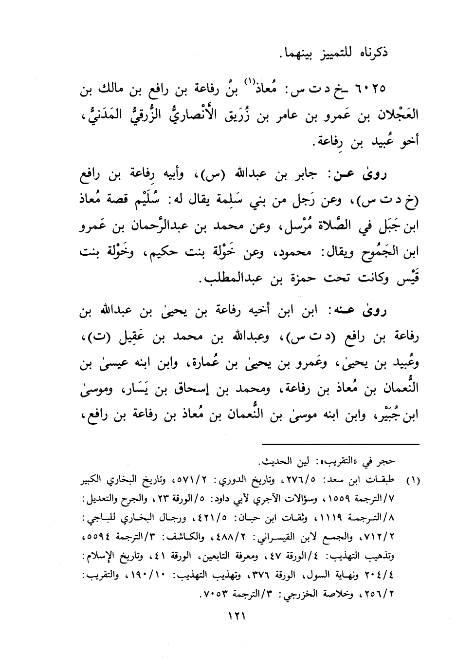 6025 - خ د ت س: معاذ بن رفاعة بن رافع بن مالك بن العجلان (1) بن عَمْرو بن عامر بن زريق الأَنْصارِيّ الزرقي المدني أخو عُبَيد بْن رفاعة.