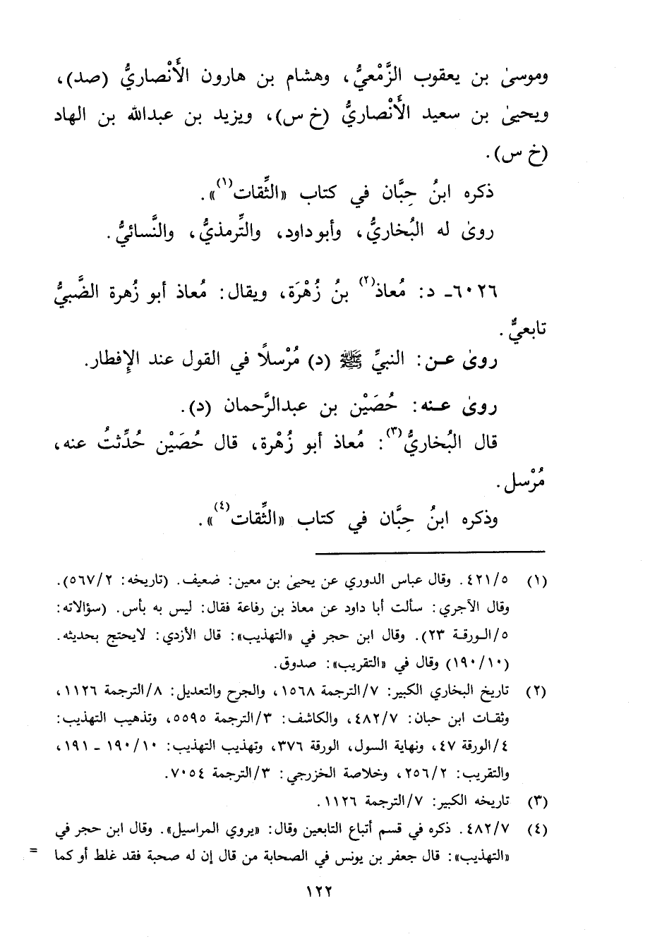 ذكره ابنُ حِبَّان فِي كتاب "الثقات (1) "روى له البخاري، وأبو داود والتِّرْمِذِيّ والنَّسَائي. 6026 - د: معاذ بن زهرة (2) ويُقال: معاذ أَبُو زهرة الضبي تابعي.