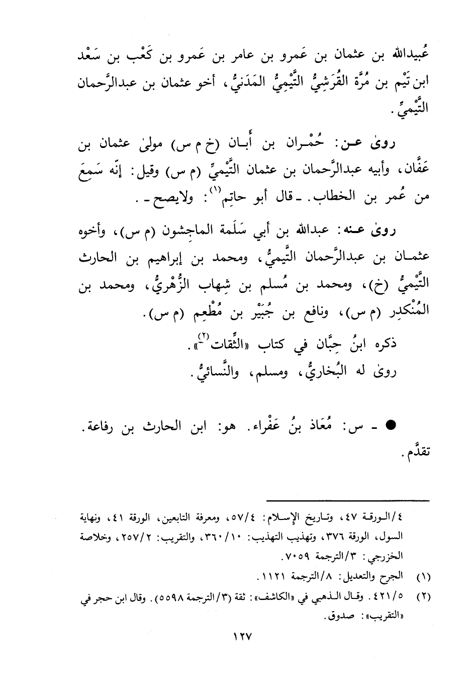 4 / الورقة 47، وتاريخ الاسلام: 4 / 57، ومعرفة التابعين الورقة 41، ونهاية السول، الورقة 376، وتهذيب التهذيب: 10 / 360، والتقريب: 2 / 257 وخلاصة الخزرجي: 3 / الترجمة 7059.