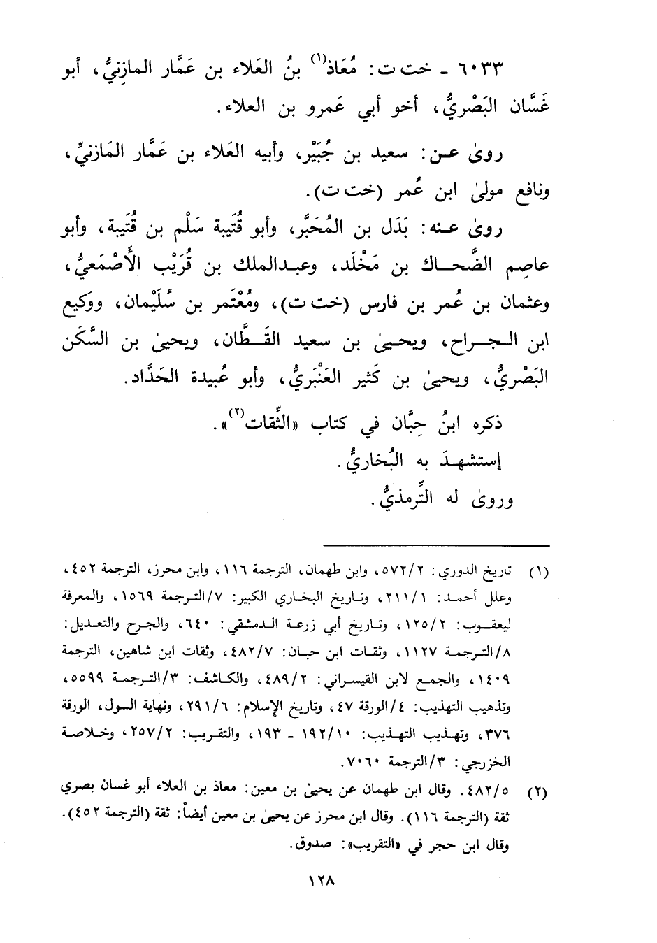 6033 - خت د: معاذ بن العلاء بن عمار المازني (1) أَبُو غسان البَصْرِيّ، أخو أَبِي عَمْرو بْن العلاء.