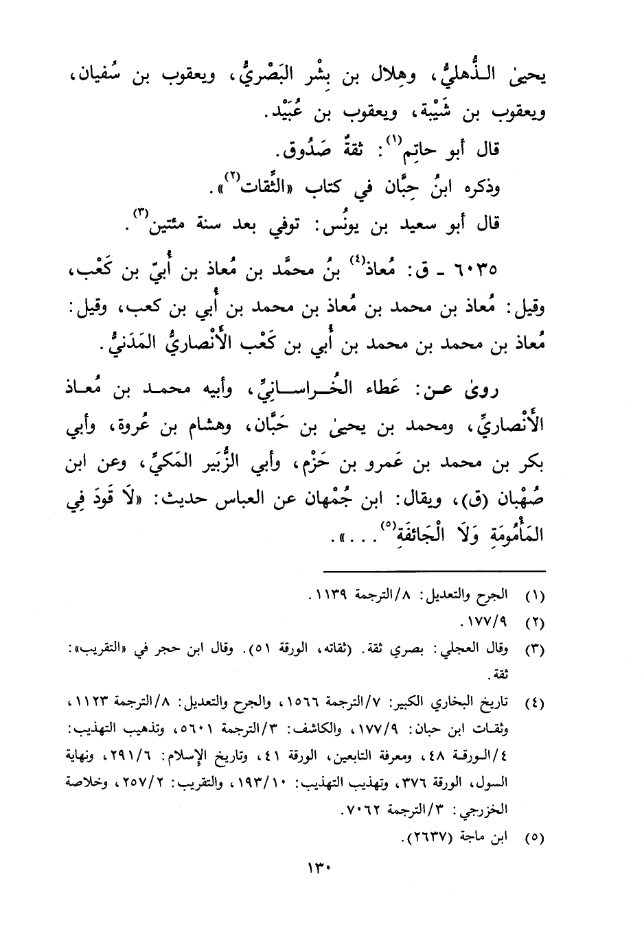 6035 - ق: معاذ بن مُحَمَّد بن معاذ بْن أَبي بْن كَعْب (4) وقيل: معاذ بْن مُحَمَّد بْن معاذ بْن مُحَمَّد بْن أَبي بن كعب، وقيل: معاذ بْن مُحَمَّدِ بْنِ مُحَمَّدِ بْنِ أَبي بْن كعب الأَنْصارِيّ المدني. رَوَى عَن: عطاء الخراساني وأبيه مُحَمَّد بْن معاذ الأَنْصارِيّ، ومُحمد بْن يَحيى بْن حَبَّان، وهشام بْن عروة، وأبي بكر بْن مُحَمَّد بْن عَمْرو بْن حزم، وأبي الزبير المكي، وعن ابْن صهبان (ق) ويُقال: ابن جمهان عَن العباس حديث: "لا قود في المأمومة ولا الجائفة (5) ....