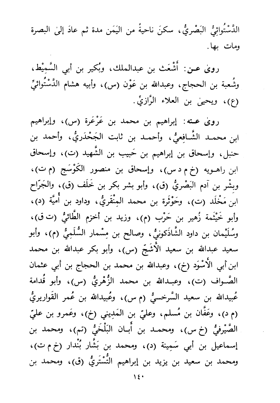 رَوَى عَن: أشعث بْن عَبْد الملك، وبكير بْن أَبي السميط وشعبة بْن الحجاج، وعَبد الله بْن عون (س) وأبيه هشام الدستوائي (ع) ويحيى بن العلاء الرازي.