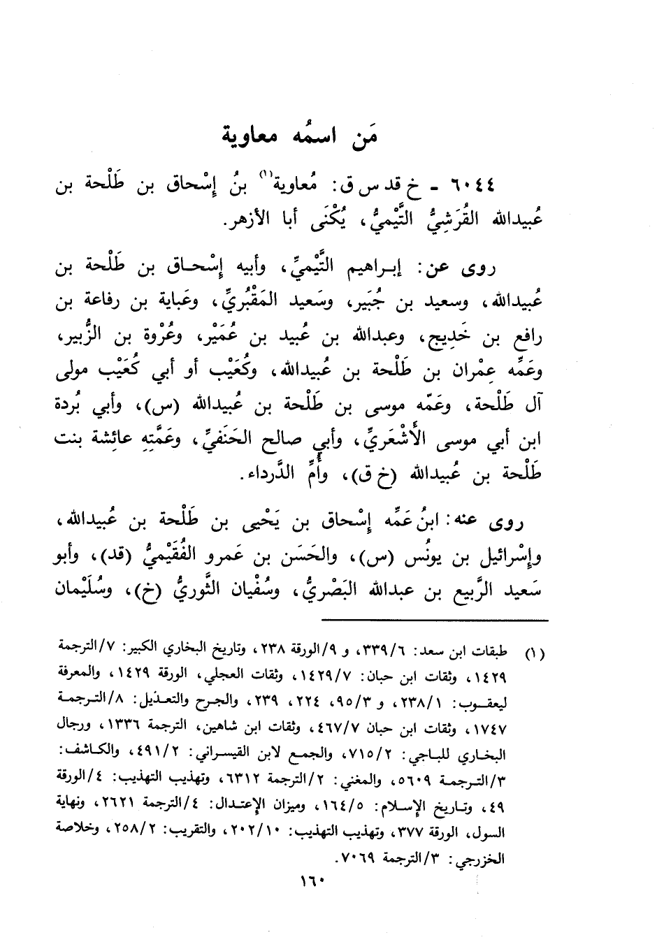 6044 - خ قد س ق: معاوية بن إسحاق بْن طلحة بْن عُبَيد الله القرشي التَّيْمِيّ (1) ، يكنى أَبَا الأزهر.