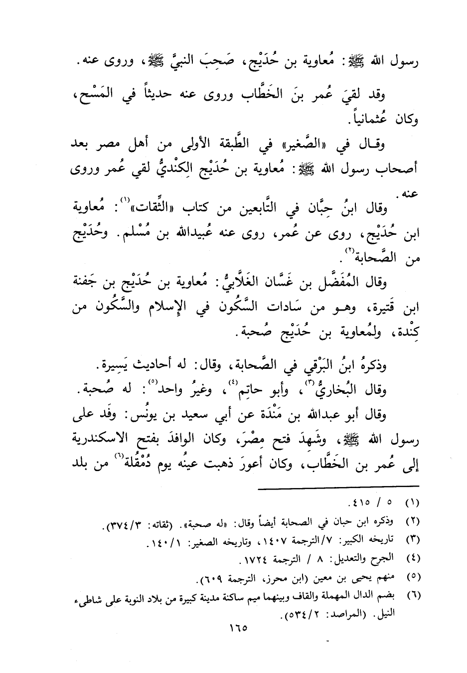 وَقَال في "الصغير "في الطبقة الأولى من أهل مصر بعد أصحاب رسول الله صلى الله عله وسلم: معاوية بْن حديج الكندي لقي عُمَر وروى عنه.