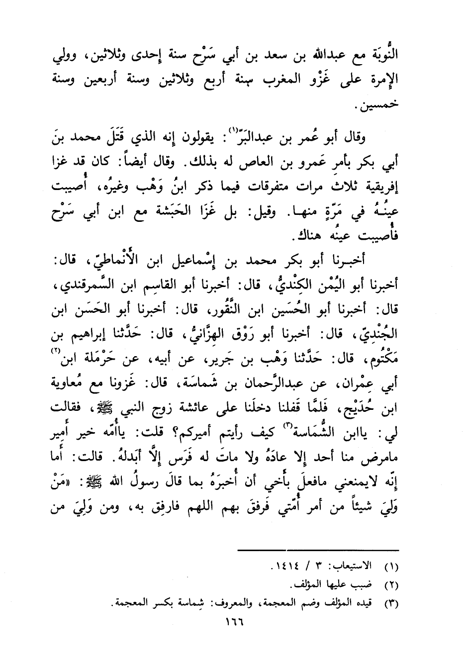 وَقَال أَبُو عُمَر بْن عَبد الْبَرِّ (1) : يقولون إنه الذي قتل مُحَمَّد بْن أَبي بكر بأمر عَمْرو بْن العاص لَهُ بذلك. وَقَال أيضا: كَانَ قد غزا إفريقية ثلاث مرات متفرقات فيما ذكر ابن وهب وغيره، أصيبت عينه فِي مرة منها.
