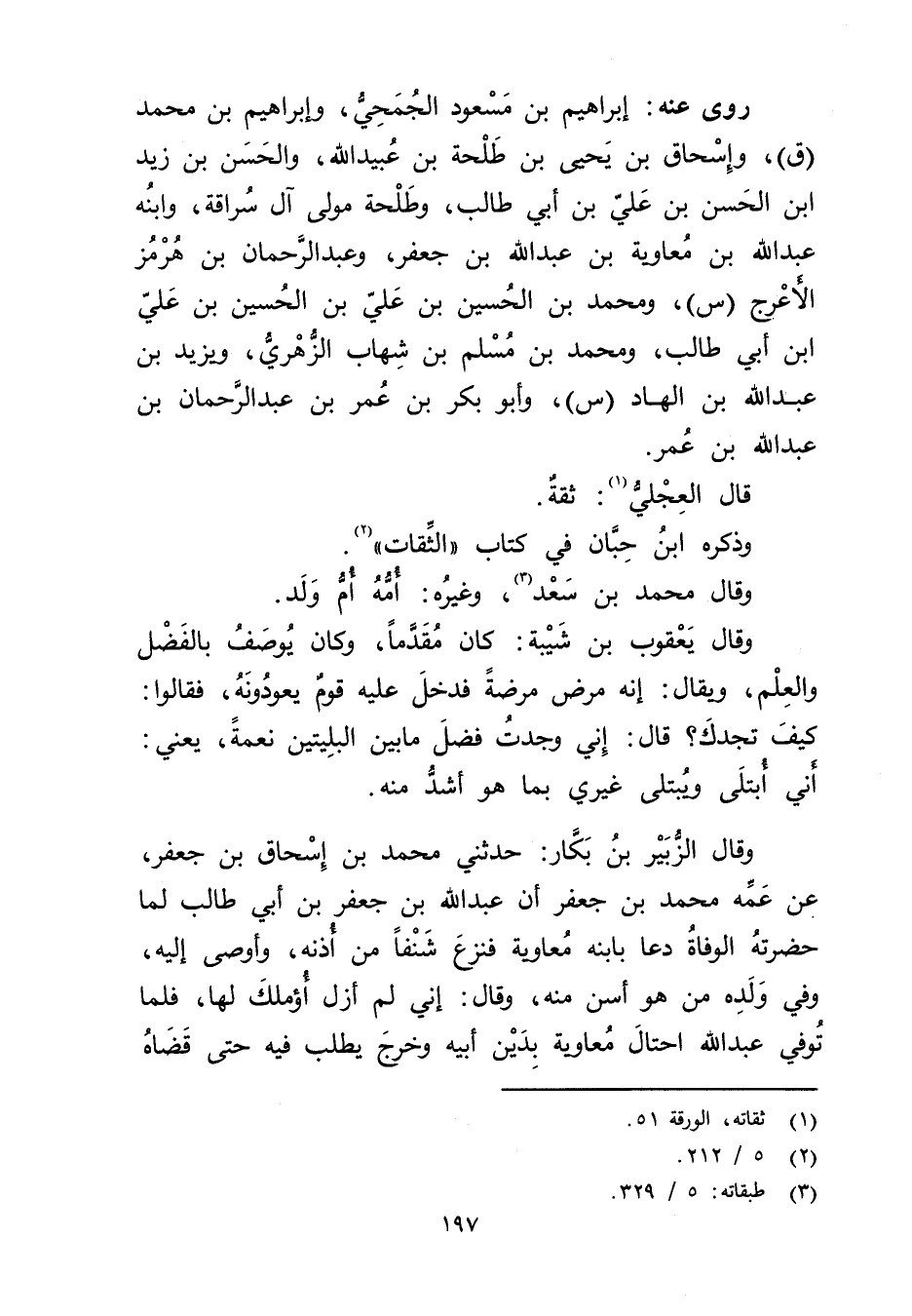 وَقَال الزبير بْن بكار: حدثني مُحَمَّد بْن إسحاق بْن جعفر عَن عمه مُحَمَّد بْن جعفر أن عَبد اللَّهِ بْن جعفر بْن أَبي طالب لما حضرته الوفاة دعا بابنه معاوية فنزع شنفا من أذنه، وأوصى إليه وفي ولده من هو أسن منه، وَقَال: إني لم أزل أؤملك لَهَا، فلما توفي عَبد اللَّهِ احتال معاوية بدين أبيه وخرج يطلب فيه حتى قضاه