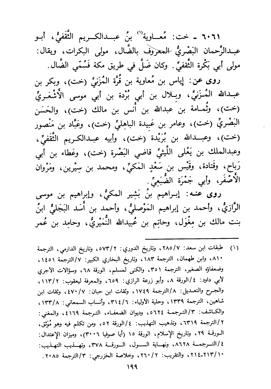 6061 - خت: معاوية بن عَبْد الكريم الثقفي (1) ، أَبُو عَبْد الرحمن البَصْرِيّ المعروف بالضال، مولى البكرات، ويُقال: مولى أَبِي بكرة الثقفي. وكان ضل فِي طريق مكة فسمي الضال.