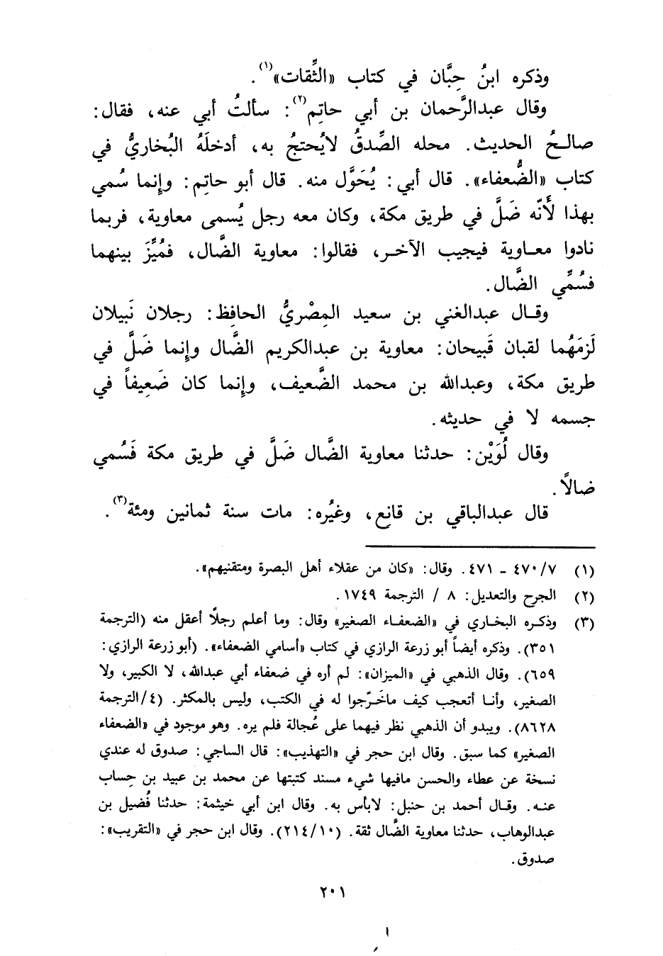 وَقَال عَبْد الرحمن بْن أَبي حَاتِم (2) : سَأَلتُ أَبِي عَنْهُ، فقال: صالح الحديث. محله الصدق لا يحتج به، أدخله البخاري فِي كتاب "الضعفاء "قال أَبِي: يحول منه. قال أَبُو حاتم: وإنما سمي بهذا لأنه ضل فِي طريق مكة، وكان معه رجل يسمى معاوية، فربما نادوا معاوية فيجيب الآخر، فقالوا: معاوية الضال، فميز بينهما فسمي الضال.