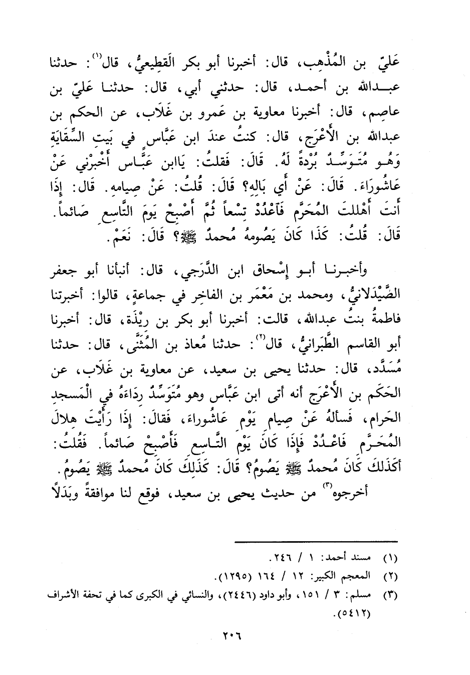 وأخبرنا أَبُو إِسْحَاقَ ابْنُ الدَّرَجِيِّ، قال: أَنْبَأَنَا أَبُو جَعْفَرٍ الصَّيْدَلانِيُّ، ومُحَمَّدُ بْنُ مَعْمَرِ بْنِ الْفَاخِرِ فِي جَمَاعَةٍ، قَالُوا: أَخْبَرَتْنا فَاطِمَةُ بِنْتُ عَبد اللَّهِ، قَالَتْ: أخبرنا أَبُو بَكْرِ بْنُ رِيذَةَ، قال: أخبرنا أَبُو الْقَاسِمِ الطَّبَرَانِيُّ، قال (2) : حَدَّثَنَا معاذ بن المثنى، قال: حَدَّثَنَا مُسَدَّدٌ، قال: حَدَّثَنَا يَحْيَى بْنُ سَعِيد، عَنْ مُعَاوِيَةَ بْنِ غَلابٍ، عَنِ الْحَكَمِ بْنِ الأَعْرَجِ أَنَّهُ أَتَى ابْنَ عَبَّاسٍ وهُوَ مُتَوَسِّدٌ رِدَاءَهُ فِي الْمَسْجِدِ الْحَرَامِ, فَسَأَلَهُ عَنْ صِيَامِ يَوْمِ عَاشُورَاءَ، فَقَالَ: إِذَا رَأَيْتَ هِلالَ المحرم فاعدد فإذا كان يوم التَّاسِعُ فَأَصْبِحْ صَائِمًا. فَقُلْتُ: أَكَذَلِكَ كَانَ مُحَمَّدٌ صَلَّى اللَّهُ عليه وسلم يَصُومُ؟ قال: كَذَلِكَ كَانَ مُحَمَّد صَلَّى اللَّهُ عَلَيْهِ وسَلَّمَ يَصُومُ.