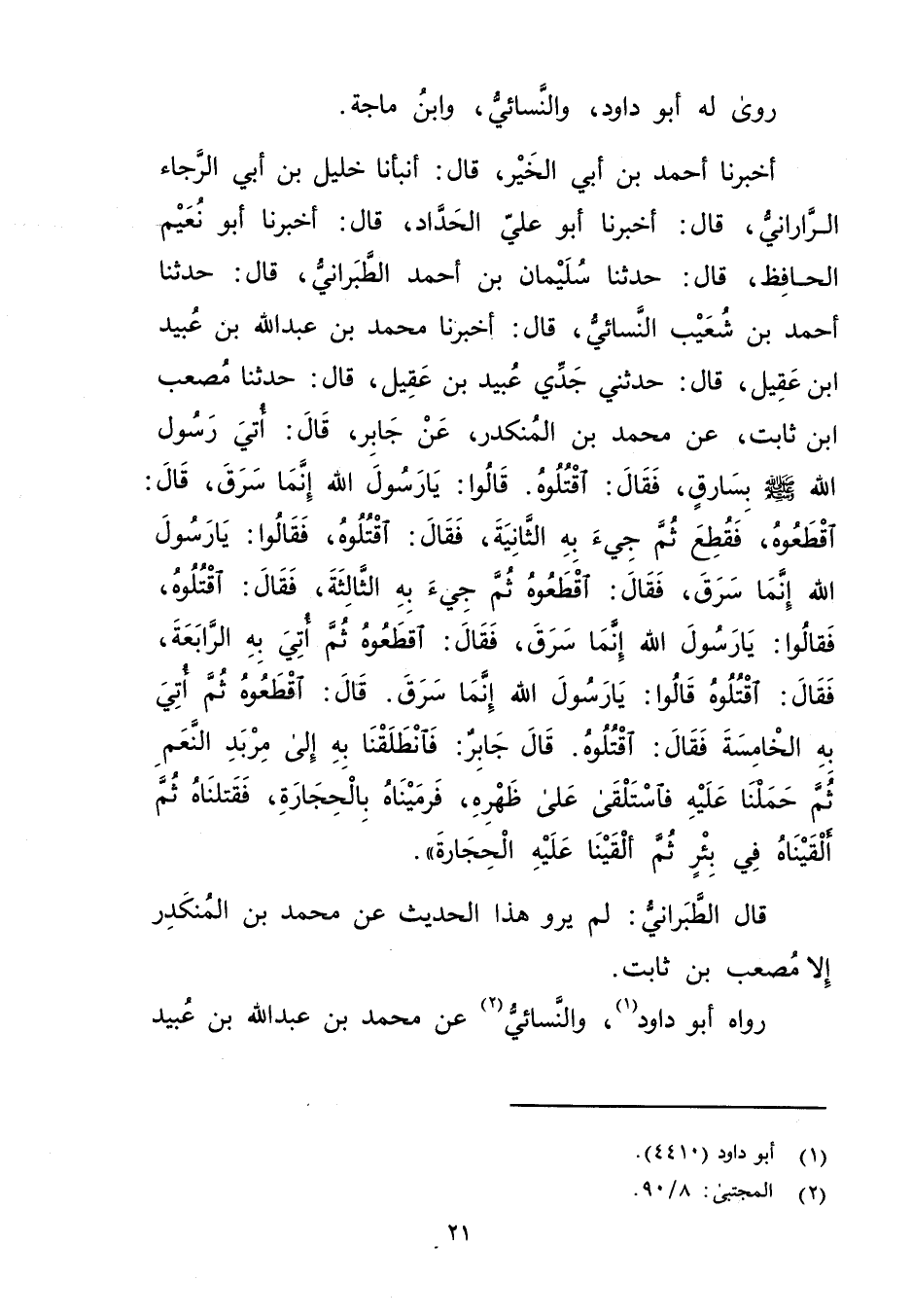 أَخْبَرَنَا أَحْمَدُ بْنُ أَبي الْخَيْرِ، قال: أَنْبَأَنَا خَلِيلُ بْنُ أَبي الرَّجَاءِ الرَّارَانِيُّ، قال: أَخْبَرَنَا أَبُو عَلِيّ الحداد، قال: أَخْبَرَنَا أبو نعيم الحافظ، قال: حَدَّثَنَا سُلَيْمان بْنُ أَحْمَدَ الطَّبَرَانِيُّ، قال: حَدَّثَنَا أَحْمَدُ بْنُ شُعَيْبٍ النَّسَائي، قال: أَخْبَرَنَا مُحَمَّدُ بْنُ عَبد الله بن عُبَيد ابن عُقَيْلٍ، قال: حَدَّثَنِي جَدِّي عُبَيد بْنُ عُقَيْلٍ، قال: حَدَّثَنَا مُصْعَبُ ابن ثابت، عَنْ مُحَمَّد بْن المنكدر، عَنْ جَابِرٍ، قال: أُتِيَ رَسُولُ اللَّهِ صلى الله عليه وسلم بِسَارِقٍ، فَقَالَ: اقْتُلُوهُ، قَالُوا: يَا رَسُولَ اللَّهِ إِنَّمَا سَرَقَ، قال: اقطعوه، فقطع ثم جئ بِهِ الثَّانِيَةَ، فَقَالَ: اقْتُلُوهُ، فَقَالُوا: يَا رَسُولَ اللَّهِ إِنَّمَا سَرَقَ، فقال: اقطعوه ثم جئ بِهِ الثَّالِثَةَ، فَقَالَ: اقْتُلُوهُ، فَقَالُوا: يَا رَسُولَ اللَّهِ إِنَّمَا سَرَقَ، فَقَالَ: اقْطَعُوهُ ثُمَّ أُتِيَ بِهِ الرَّابِعَةَ، فَقَالَ: اقْتُلُوهُ قَالُوا: يَا رَسُولَ اللَّهِ إِنَّمَا سَرَقَ. قال: اقْطَعُوهُ ثُمَّ أُتِيَ بِهِ الْخَامِسَةَ فَقَالَ: اقْتُلُوهُ. قال جَابِرٌ: فَانْطَلَقْنَا بِهِ إِلَى مِرْبَدِ النَّعَمِ ثُمَّ حَمَلْنَا عَلَيْهِ فَاسْتَلْقَى عَلَى ظَهْرِهِ. فَرَمَيْنَاهُ بِالْحِجَارَةِ، فَقَتَلْنَاهُ ثُمَّ أَلَقَيْنَاهُ فِي بِئْرٍ ثُمَّ أَلْقَيْنَا عَلَيْهِ الْحِجَارَةَ.