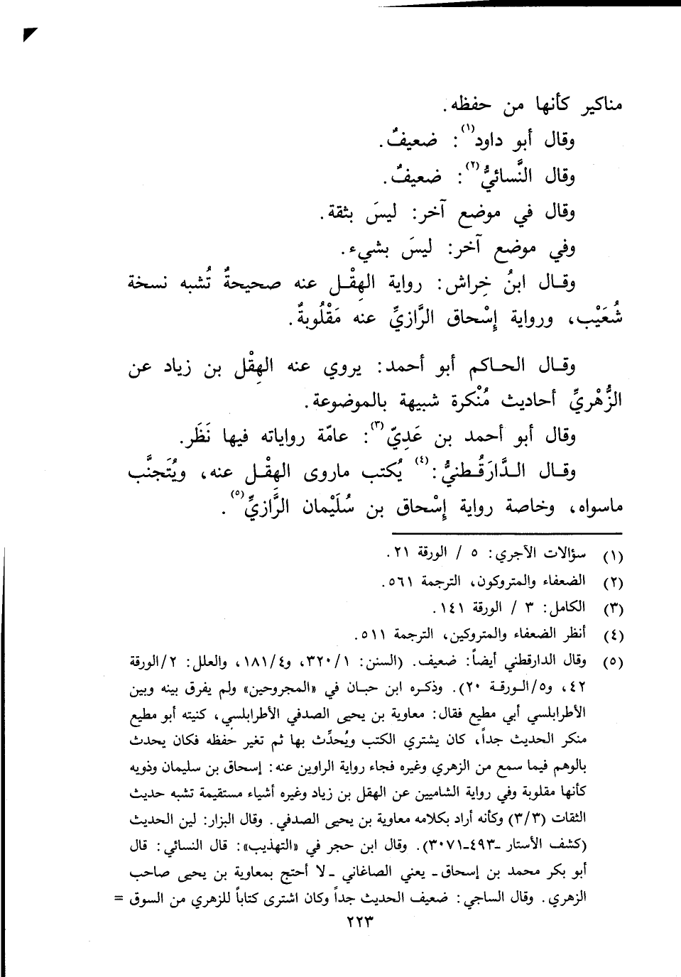 وَقَال الدَّارَقُطْنِيُّ: (4) يكتب ماروى الهقل عنه، ويتجنب ما سواه وخاصة رواية إسحاق بْن سُلَيْمان الرازي (5) .
