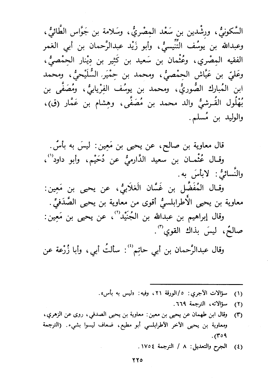 (3) وَقَال ابن طهمان عَن يحيى بْن مَعِين: معاوية بن يحيى الصدفي روى عن الزُّهْرِيّ ومعاوية بن يحيى الآخر الاطرابلسي أبو مطيع ضعاف ليسوا بشيءٍ (الترجمة 359) .