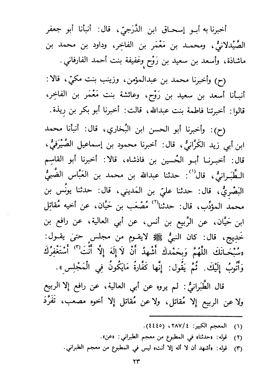 (ح) : وأخبرنا أَبُو الْحَسَنِ بْنُ الْبُخَارِيِّ، قال: أَنْبَأَنَا محمد ابن أَبي زَيْدٍ الْكَرَّانِيُّ، قال: أَخْبَرَنَا مَحْمُودُ بْنُ إِسْمَاعِيلَ الصَّيْرَفِيُّ، قال: أَخْبَرَنَا أَبُو الْحُسَيْنِ بْنُ فَاذْشَاهِ، قَالا: أخبرنا أَبُو الْقَاسِمِ الطَّبَرَانِيُّ، قال (1) : حَدَّثَنَا عَبد اللَّهِ بْن محمد بن العباس الضبي البَصْرِيّ، قال: حَدَّثَنَا علي بْن المديني، قال: حَدَّثَنَا يُونُسُ بْنُ مُحَمَّدٍ الْمُؤَدِّبُ، قال: حَدَّثَنَا (2) مُصْعَبُ بْنُ حيان، عن أخيه مقاتل ابن حَيَّانَ، عَنِ الرَّبِيعِ بْنِ أَنَسٍ، عَن أَبِي الْعَالِيَةِ. عَنْ رَافِعِ بْنِ خَدِيجٍ. قال: كَانَ النَّبِيُّ صلى الله عليه وسلم لا يقوم من مجلس حتى يقوم: "سُبْحَانَكَ اللَّهُمَّ وبِحَمْدِكَ أَشْهَدُ أَنْ لا إِلَهَ إِلا أَنْتَ (3) أَسْتَغْفِرُكَ وأَتُوبُ إِلَيْكَ. ثُمَّ يَقُولُ: إِنَّهَا كَفَّارَةُ مَا يَكُونُ فِي الْمَجْلِسِ.