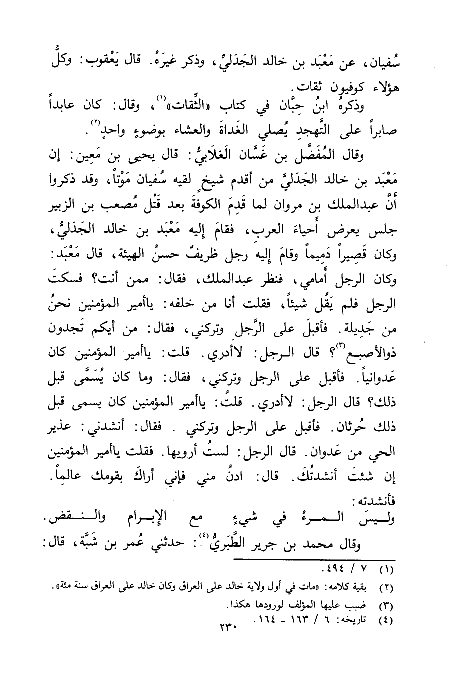 وَقَال المفضل بْن غسان الغلابي: قال يحيى بْن مَعِين: إن معبد بْن خالد الجدلي من أقدم شيخ لقيه سفيان موتا، وقد ذكروا أن عَبد المَلِك بْن مروان لما قدم الكوفة بعد قتل مصعب بْن الزبير جلس يعرض أحياء العرب فقام إليه معبد بْن خالد الجدلي وكان قصيرا دميما وقام إليه رجل ظريف حسن الهيئة قال معبد: وكان الرجل أمامي فنظر عَبد المَلِك فقال: ممن أنت؟ فسكت الرجل فلم يقل شيئا فقلت أنا من خلفه: يَا أمير المؤمنين نحن من جديلة فأقبل على الرجل وتركني فقال: من أيكم تجدون ذو الاصبع (3) ؟ قال الرجل: لاأدري قُلْتُ: يَا أمير المؤمنين كَانَ عدوانيا فأقبل على الرجل وتركني فقال: وما كَانَ يسمى قبل ذلك؟ قال الرجل: لاأدري قُلْتُ: يَا أمير المؤمنين كَانَ يسمى قبل ذلك حرثان فأقبل على الرجل وتركني فقال: أنشدني: عذير الحي من عدوان قال الرجل: لست أرويها فقلت يَا أمير المؤمنين إن شئت أنشدتك قال: ادن مني فإني أراك بقومك عالما فأنشدته: