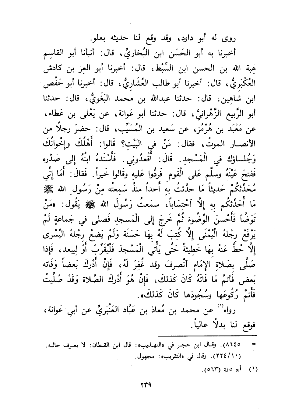 أخبرنا بِهِ أَبُو الْحَسَنِ بْنُ الْبُخَارِيِّ قال: أَنْبَأَنَا أَبُو الْقَاسِمِ هِبَةُ اللَّهِ بْنُ الْحَسَنِ بْنِ السِّبْطِ قال: أَخْبَرَنَا أَبُو الْعِزِّ بْنُ كَادِشَ الْعُكْبَرِيُّ قال: أَخْبَرَنَا أَبُو طالب العشاوي قال: أخبرنا أبو حفص ابن شَاهِينَ قال: حَدَّثَنَا عَبد اللَّهِ بْنُ مُحَمَّدٍ الْبَغَوِيُّ قال: حَدَّثَنَا أَبُو الربيع الزهراني قال: حَدَّثَنَا أَبُو عَوَانَةَ عَنْ يَعْلَى بْنِ عَطَاءٍ عَنْ مَعْبَدِ بْنِ هُرْمُزٍ عن سَعِيد بْن المُسَيَّب قال: حَضَرَ رَجُلا مِنَ الأَنْصَارِ الْمَوْتُ فَقَالَ: مَنْ فِي الْبَيْتِ؟ قَالُوا: أَهْلُكَ وإِخْوَانُكَ وجُلَسَاؤُكَ فِي الْمَسْجِدِ قال: أَقْعِدُونِي فَأَسْنَدَهُ ابْنُهُ إِلَى صَدْرِهِ فَفَتَحَ عَيْنَهُ وسَلَّمَ عَلَى الْقَوْمِ فَرَدُّوا عَلَيْهِ وَقَالوا خَيْرًا فَقَالَ: أَمَا إِنِّي مُحَدِّثُكُمْ حَدِيثًا مَا حَدَّثْتُ بِهِ أَحَدًا مُنْذُ سَمِعْتَهُ مِنْ رَسُولِ اللَّهِ صَلَّى اللَّهُ عَلَيْهِ وسَلَّمَ مَا أُحَدِّثُكُمْ بِهِ إِلا احْتِسَابًا سَمِعْتُ رَسُولَ اللَّهِ صلى الله عليه وسلم يَقُولُ: مَنْ تَوَضَّأَ فَأَحْسَنَ الْوُضُوءَ ثُمَّ خَرَجَ إِلَى الْمَسْجِدِ فَصَلَّى فِي جَمَاعَةٍ لَمْ يَرْفَعْ رِجْلَهُ الْيُمْنَى إِلا كُتِبَ لَهُ بِهَا حَسَنَةٌ ولَمْ يَضَعْ رِجْلَهُ الْيُسْرَى إِلا حُطَّ عَنْهُ بِهَا خَطِيئَةٌ حَتَّى يَأْتِيَ الْمَسْجِدَ فَلْيُقَرِّبْ أَوْ لِيُبَعِّدْ فَإِذَا صَلَّى بِصَلاةِ الإِمَامِ انْصَرَفَ وقَدْ غُفِرَ لَهُ فَإِنْ أَدْرَكَ بَعْضًا وفَاتَهُ بَعْضٌ فَأَتَمَّ مَا فَاتَهُ كَانَ كَذَلِكَ فَإِنْ هُوَ أَدْرَكَ الصَّلاةَ وقَدْ صُلِّيَتْ فَأَتَمَّ رُكُوعَهَا وسُجُودَهَا كَانَ كَذَلِكَ".