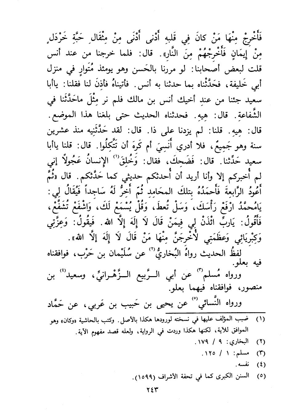 فَأَخْرِجْ مِنْهَا مَنْ كَانَ فِي قَلْبِهِ أَدْنَى أَدْنَى مِنْ مِثْقَالِ حَبَّةِ خَرْدَلٍ مِنْ إِيمَانٍ فَأُخْرِجُهُمْ مِنَ النَّارِ" قال: فَلَمَّا خَرَجْنَا مِنْ عِنْدِ أَنَسٍ قُلْتُ لِبَعْضِ أَصْحَابِنَا: لَوْ مَرَرْنَا بِالْحَسَنِ وهُوَ يَوْمَئِذٍ مُتَوَارٍ فِي مَنْزِلِ أَبِي خَلِيفَةَ فحَدَّثَنَاه بِمَا حَدَّثَنَا بِهِ أَنَسٌ فَأَتَيْنَاهُ فَأَذِنَ لَنَا فَقُلْنَا: يَا أَبَا سَعِيد جِئْنَا مِنْ عِنْدَ أَخِيكَ أَنَسِ بْنِ مَالِكٍ فَلَمْ نَرَ مِثْلَ مَا حَدَّثَنَا في الشفاعة قال: هيه فحَدَّثَنَا الْحَدِيثَ حَتَّى بَلَغْنَا هَذَا الْمَوْضِعَ قال: هِيهْ قُلْنَا: لَمْ يَزِدْنَا عَلَى ذَا قال: لَقَدْ حَدَّثَنِيهِ مُنْذُ عِشْرِينَ سَنَةً وهُوَ جَمِيعٌ فَلا أَدْرِي أَنَسِيَ أَمْ كَرِهَ أَنْ تَتَّكِلُوا قال: قُلْنَا يَا أَبَا سَعِيد حَدَّثَنَا قال: فَضَحِكَ فَقَالَ: وخُلِقَ (1) الإِنْسَانُ عَجُولا إِنِّي لَمْ أُخْبِرْكُمْ إِلا وأَنَا أُرِيدُ أَنْ أُحَدِّثَكُمْ حَدِيثِي كَمَا حَدَّثَكُمْ قال: ثُمَّ أَعُودُ الرَّابِعَةَ فَأَحْمَدُهُ بِتِلْكَ الْمَحَامِدِ ثُمَّ أَخِرُّ لَهُ سَاجِدًا فَيُقَالُ لِي: يَا مُحَمَّدُ ارْفَعْ رَأْسَكَ وسَلْ تُعْطَ وقُلْ يُسْمَعْ لَكَ واشْفَعْ تُشَفَّعْ فَأَقُولُ: يَا رَبِّ ائْذَنْ لِي فِيمَنْ قال لاإله إِلا اللَّهُ فَيَقُولُ: وعِزَّتِي وكِبْرِيَائِي وعَظَمَتِي لأُخْرِجَنَّ مِنْهَا مَنْ قال لاإله إِلا اللَّهُ.