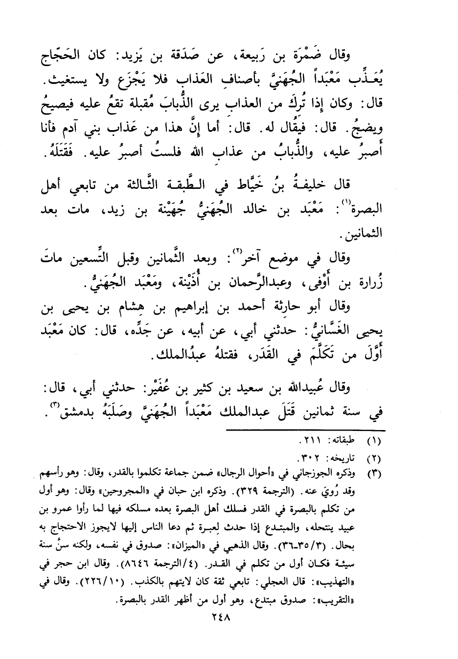 (3) وذكره الجوزجاني في " أحوال الرجال" ضمن جماعة تكلموا بالقدر، وَقَال: وهو رأسهم وقد روي عنه. (الترجمة 329) وذكره ابنُ حِبَّان في " المجروحين" وَقَال: وهو أول من تكلم بالبصرة في القدر فسلك أهل البصرة بعده مسلكه فيها لما رأوا عَمْرو بن