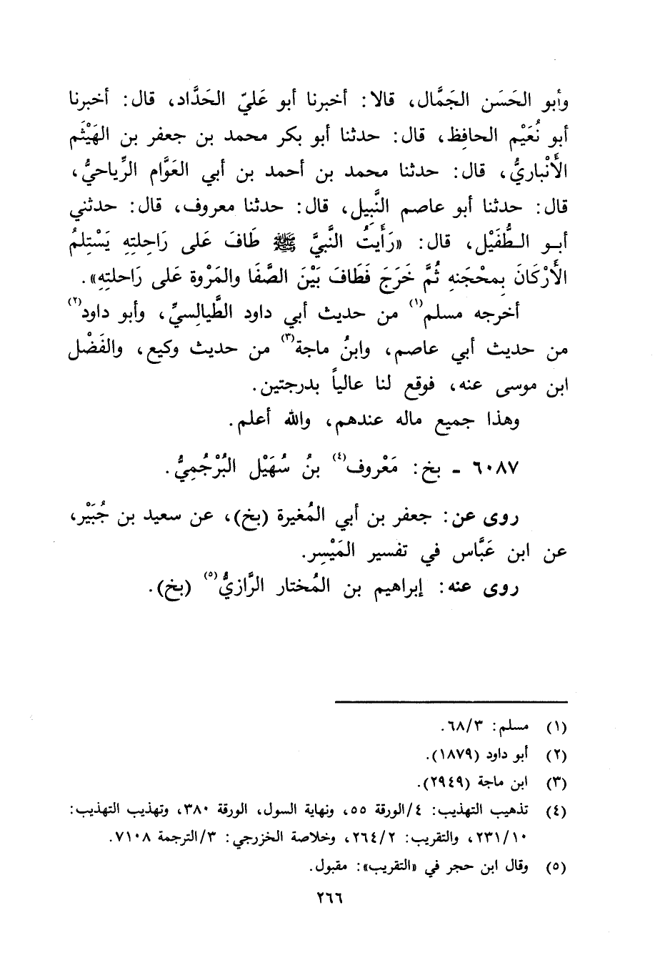 وأَبُو الحسن الجمال، قالا: أَخْبَرَنَا أَبُو عَلِيّ الحداد، قال: أَخْبَرَنَا أَبُو نعيم الحافظ، قال: حَدَّثَنَا أبو بكر مُحَمَّد بْن جعفر بْنِ الْهَيْثَمِ الأَنْبارِيّ، قال: حَدَّثَنَا مُحَمَّد بْن أَحْمَد بْن أَبي الْعَوَّامِ الرِّيَاحِيُّ، قال: حَدَّثَنَا أَبُو عَاصِمٍ النَّبِيلُ، قال: حَدَّثَنَا مَعْرُوفٌ، قال: حَدَّثَنِي أَبُو الطُّفَيْلِ، قال: رَأَيْتُ النَّبِيَّ صَلَّى اللَّهُ عَلَيْهِ وسلم طَافَ عَلَى رَاحِلَتِهِ يَسْتَلِمُ الأَرْكَانَ بِمِحْجَنِهِ ثُمَّ خَرَجَ فَطَافَ بَيْنَ الصَّفَا والْمَرْوَةِ عَلَى رَاحِلَتِهِ.