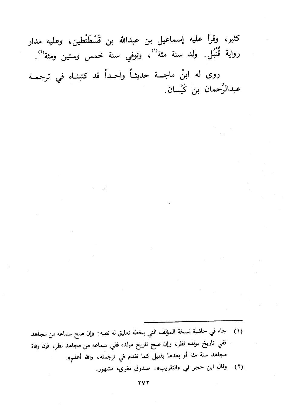 (1) جاء في حاشية نسخة المؤلف التي بخطه تعليق له نصه: إن صح سماعه من مجاهد ففي تاريخ مولده نظر، وإن صح تاريخ مولده ففي سماعه من مجاهد نظر، فإن وفاة مجاهد سنة مئة أو بعدها بقليل كما تقدم في ترجمته، والله أعلم.