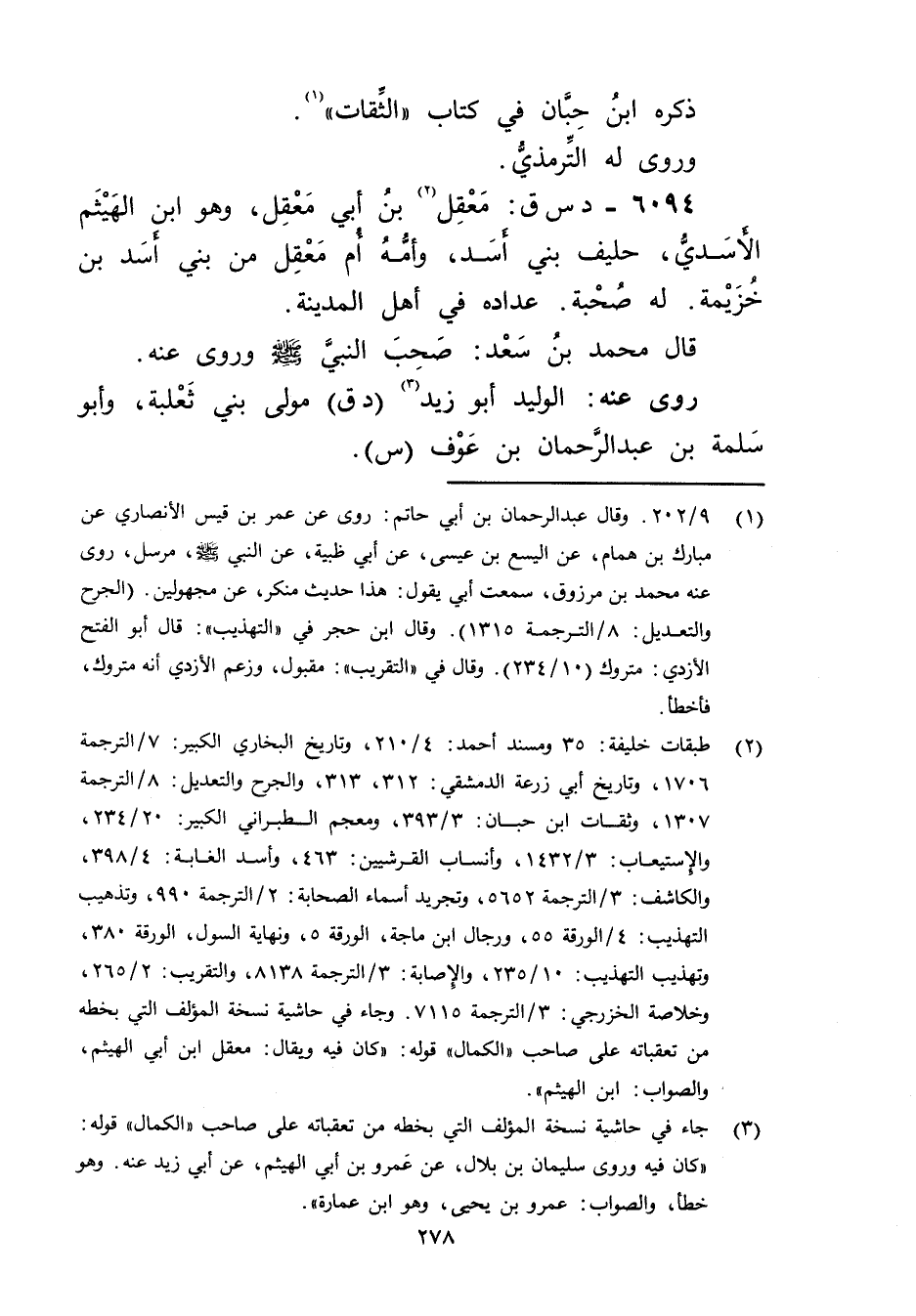 (2) طبقات خليفة 35 ومسند أحمد: 4 / 210، وتاريخ البخاري الكبير: 7 / الترجمة 1706، وتاريخ أبي زرعة الدمشقي: 312، 313، والجرح والتعديل: 8 / الترجمة 1307، وثقات ابن حبان: 3 / 393، ومعجم الطبراني الكبير: 20 / 234، والاستيعاب: 3 / 1432، وأنساب القرشيين: 463، وأسد الغابة: 4 / 398، والكاشف: 3 / الترجمة 5652، وتجريد أسماء الصحابة: 2 / الترجمة 990، وتذهيب التهذيب: 4 / الورقة 55، ورجال ابن ماجة، الورقة 5، ونهاية السول، الورقة 380، وتهذيب التهذيب: 10 / 235، والاصابة: 3 / الترجمة 8138، والتقريب: 2 / 265، وخلاصة الخزرجي: 3 / الترجمة 7115، وجاء في حاشية نسخة المؤلف التي بخطه من تعقباته على صاحب" الكمال" قوله: كان فيه ويُقال: معقل ابن أَبي الهيثم، والصواب: ابن الهيثم.
