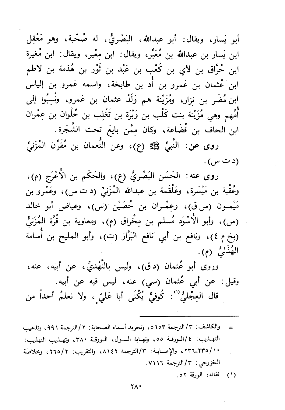 = والكاشف: 3 / الترجمة 5653، وتجريد أسماء الصحابة: 2 / الترجمة 991، وتذهيب التهذيب: 4 / الورقة 55، ونهاية السول، الورقة 380، وتهذيب التهذيب: 10 / 235 - 236، والاصابة: 3 / الترجمة 8142، والتقريب: 2 / 265، وخلاصة الخزرجي: 3 / الترجمة 7116.