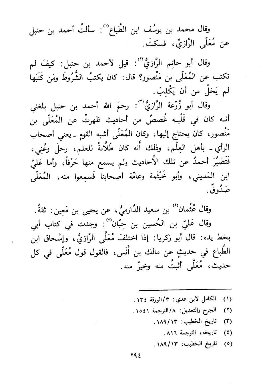 وَقَال أَبُو حاتم الرازي (2) : قيل لأحمد بْن حنبل: كيف لم تكتب عَن المعلى بْن منصور؟ قال: كَانَ يكتب الشروط ومن كتبها لم يخل من أن يكذب.