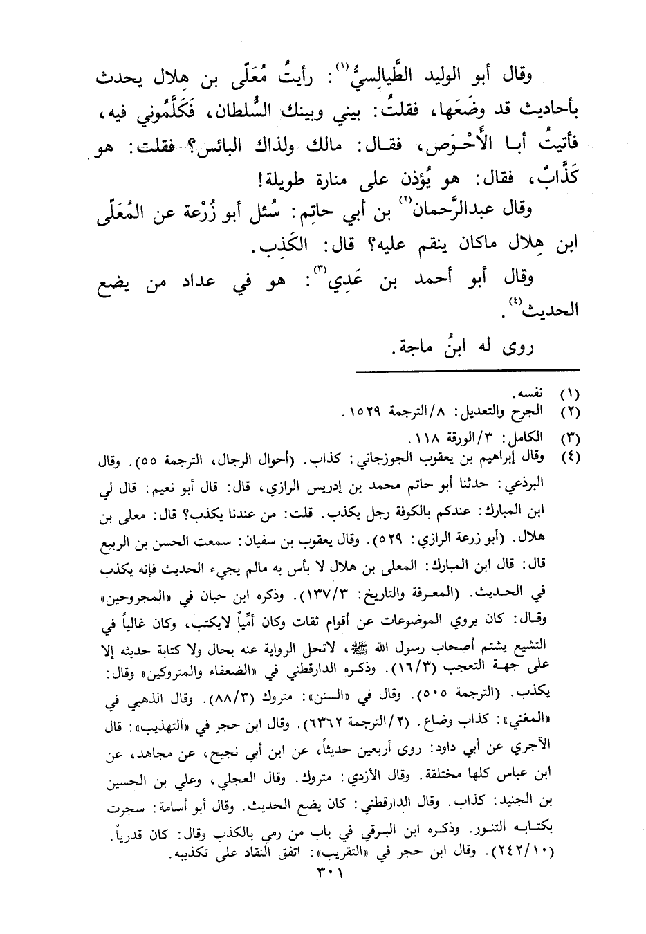 (4) وَقَال إِبْرَاهِيم بْن يعقوب الجوزجاني: كذاب. (أحوال الرجال، الترجمة 55) وَقَال البرذعي: حَدَّثَنَا أَبُو حاتم مُحَمَّد بْن إدريس الرازي، قال: قال أبو نعيم: قال لي ابن المبارك: عندكم بالكوفة رجل يكذب. قلت: من عندنا يكذب؟ قال: معلى بن هلال. (أبو زُرْعَة الرازي: 529) وَقَال يعقوب بْن سفيان: سمعت الحسن بن الربيع قال: قال ابن المبارك: المعلى بن هلال لا بأس به ما لم يجئ الحديث فإنه يكذب في الحديث. (المعرفة والتاريخ: 3 / 137) وذكره ابنُ حِبَّان في " المجروحين" وَقَال: كان يروي الموضوعات عن أقوام ثقات وكان أميا لا يكتب، وكان غاليا في التشيع يشتم أصحاب رسول الله صلى الله عليه وسلم، لا تحل الرواية عنه بحال ولا كتابة حديثه إلا على جهة التعجب (3 / 16) وذكره الدَّارَقُطنِيّ في " الضعفاء والمتروكين" وَقَال: يكذب (الترجمة 505) وَقَال في " السنن": متروك (3 / 88) وقا الذهبي في " المغني": كذاب وضاع. (2 / الترجمة 6363) وَقَال ابن حجر في " التهذيب": قال الآجري عَن أبي داود: روى أربعين حديثًا، عن ابن أَبي نجيح، عن مجاهد، عن ابن عباس كلها مختلقة. وَقَال الأزدي: متروك، وَقَال العجلي، وعلي بن الحسين ابن الجنيد: كذاب، وَقَال الدَّارَقُطنِيّ: كان يضع الحديث. وَقَال أبو أسامة: سجرت بكتابه التنور، وذكره ابن البرقي في باب من رمي بالكذب وَقَال: كان قدريا. (10 / 242) وَقَال ابن حجر في "التقريب": اتفق النقاد على تكذيبه.